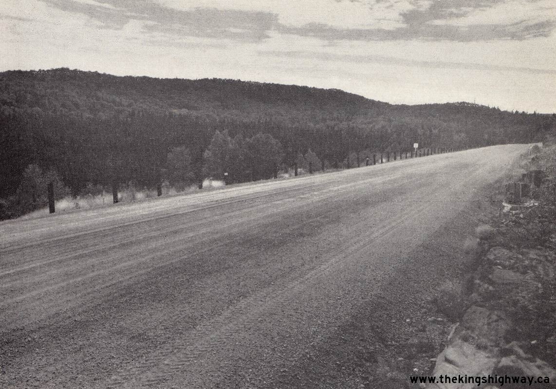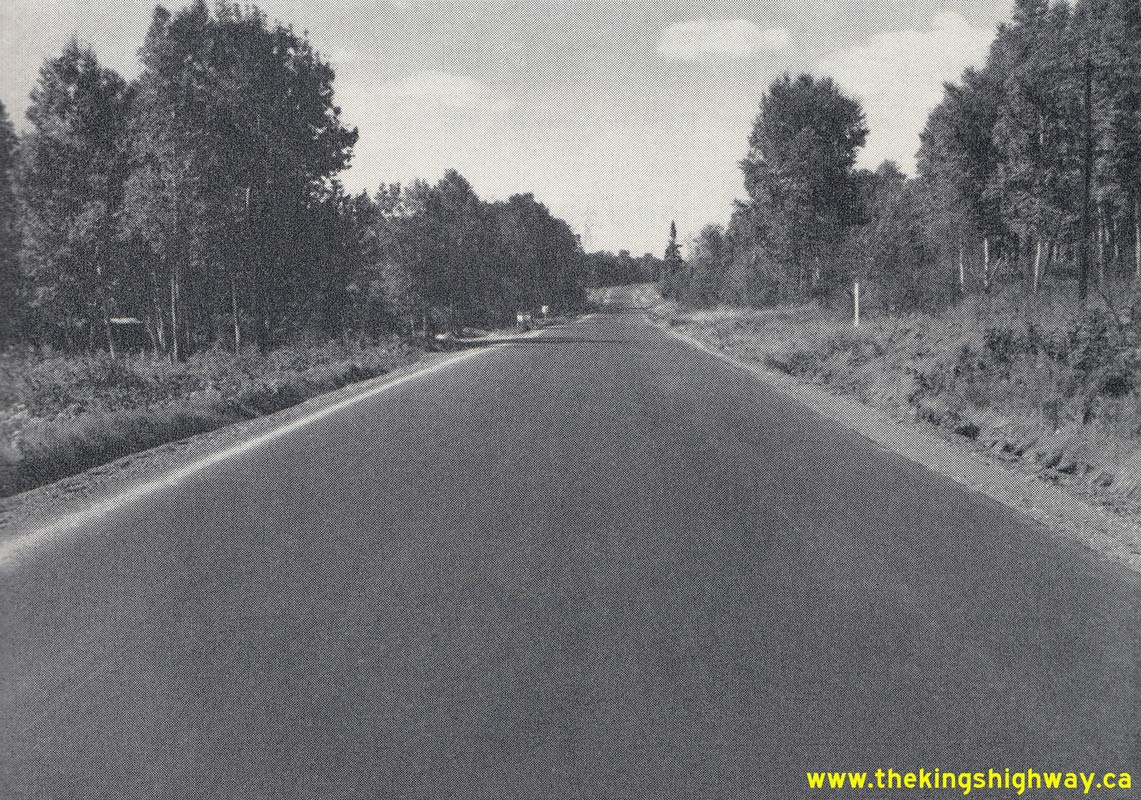 Above - Completed hot mix asphalt pavement on Hwy 17 west of the Hwy 120 Junction (today's Hwy 11) at Shabaqua Corners. See an