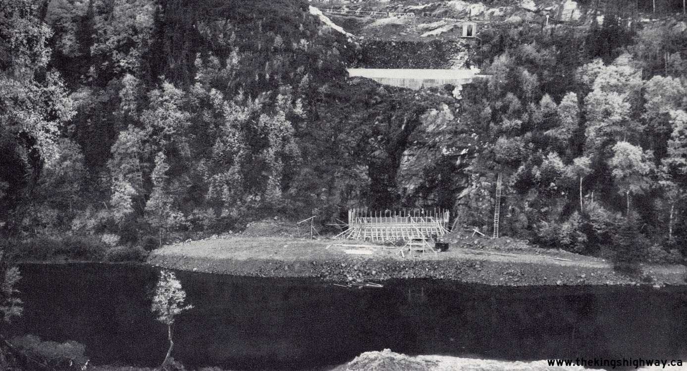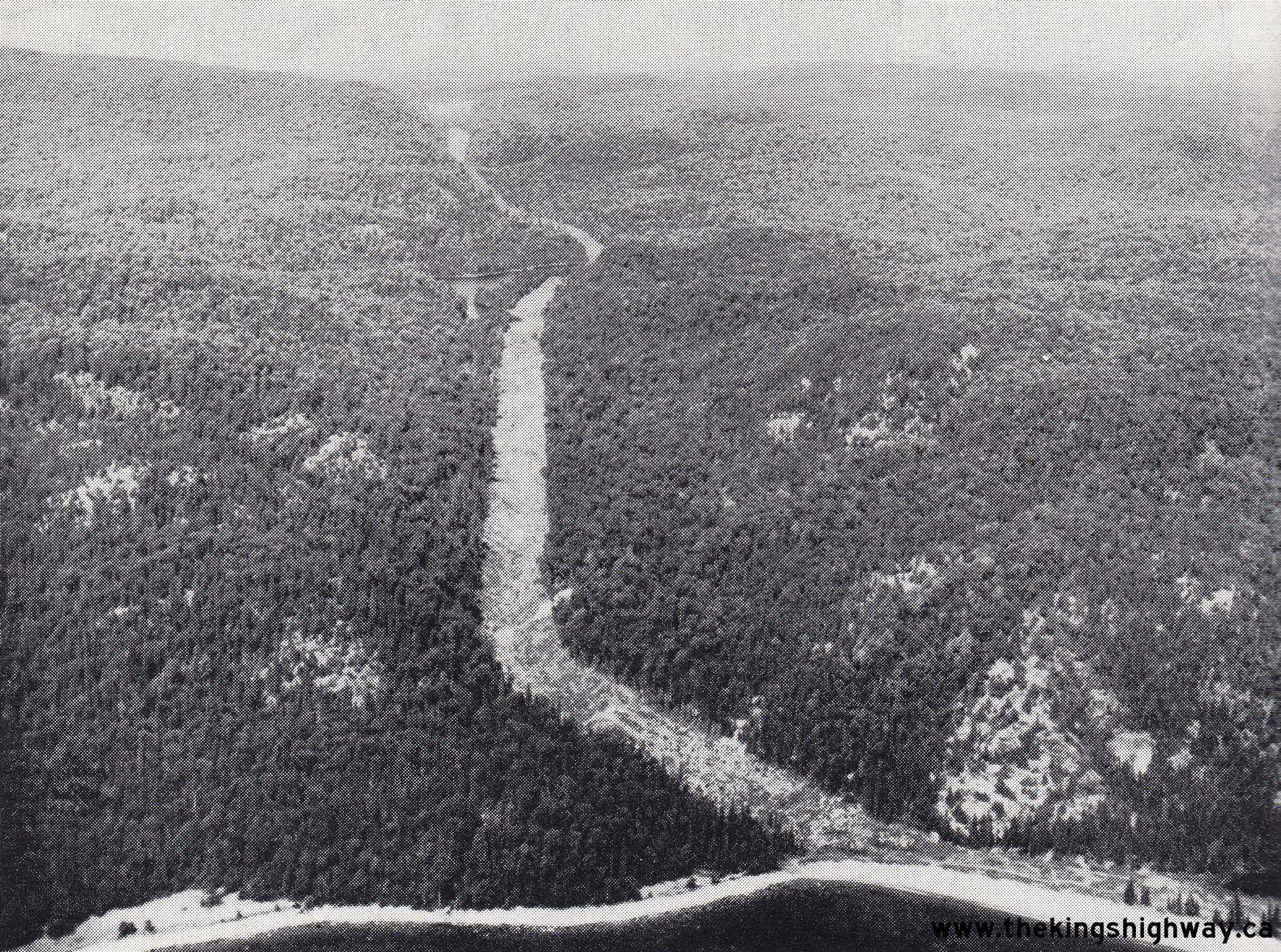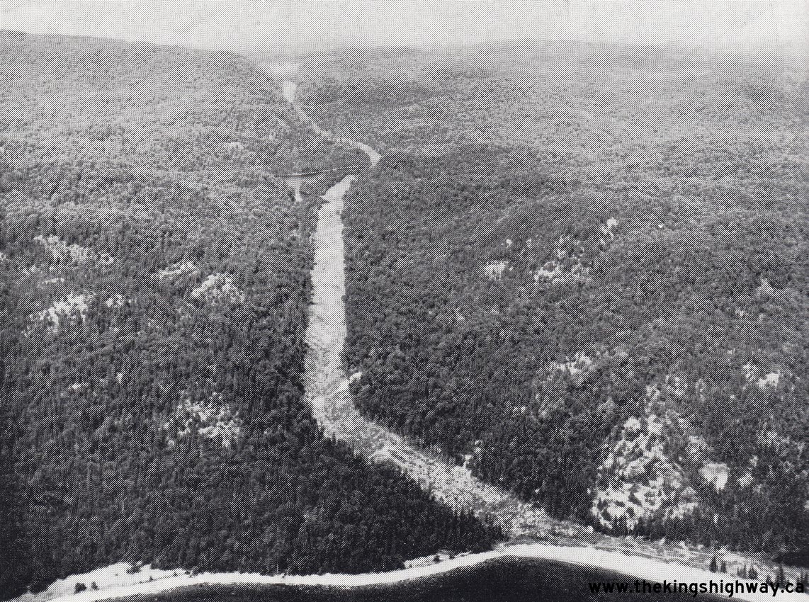 Above - Aerial view of the Barrett River Bridge construction site on Hwy 17 in Lake Superior Provincial Park (1959) (Photo courtesy of Ontario Ministry of Transportation - © King's Printer for Ontario, 1959)