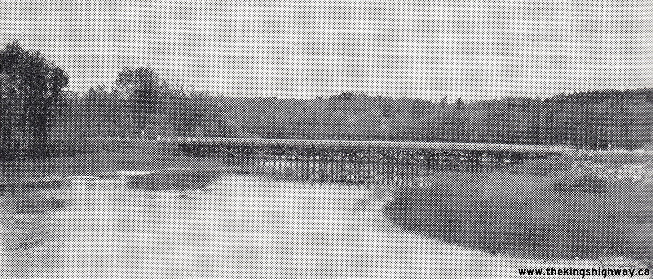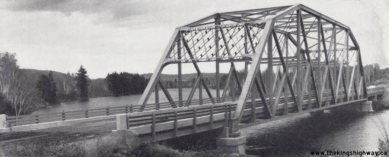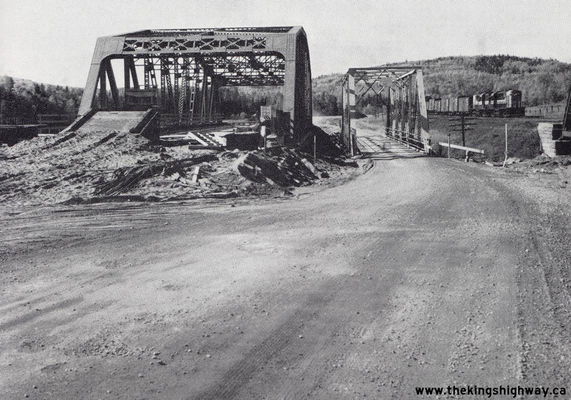 was taken in the autumn of 1957. Until the permanent bridge was completed in 1958, Hwy 17 traffic used a temporary Bailey Bridge located a short distance upstream of