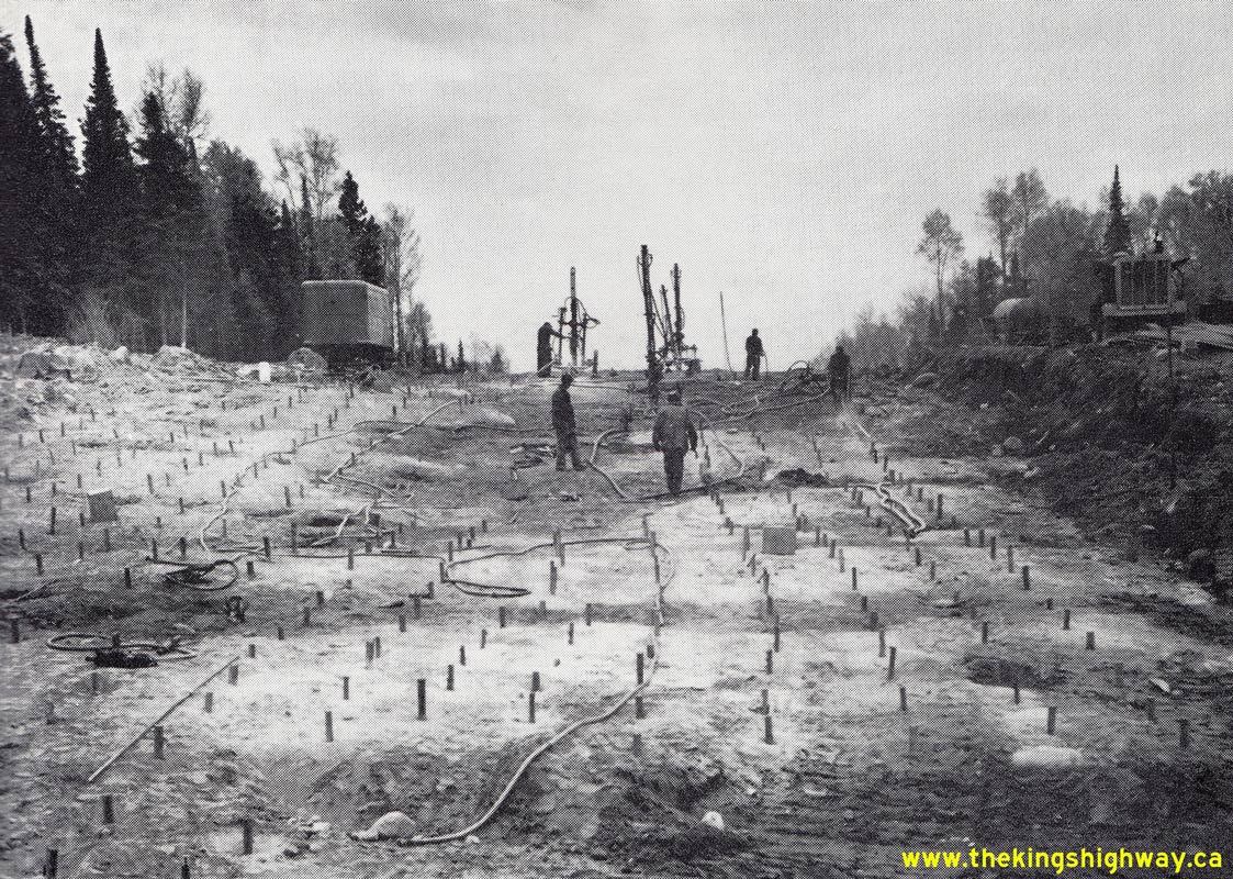 Above - Preparation to blast a new rock cut on Hwy 17, 9 miles west of the Hwy 120 Junction (today's Hwy 11) at Shabaqua Corners. Photo taken on October 1,