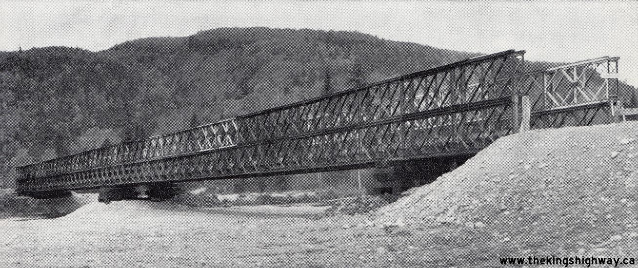 Above - Temporary Agawa River Bailey Bridge on Hwy 17 in Lake Superior Provincial Park north of Sault Ste. Marie. Photo taken on October 9, 1956. (Photo courtesy of Ontario Ministry of Transportation - © King's Printer for Ontario, 1956) ![]()