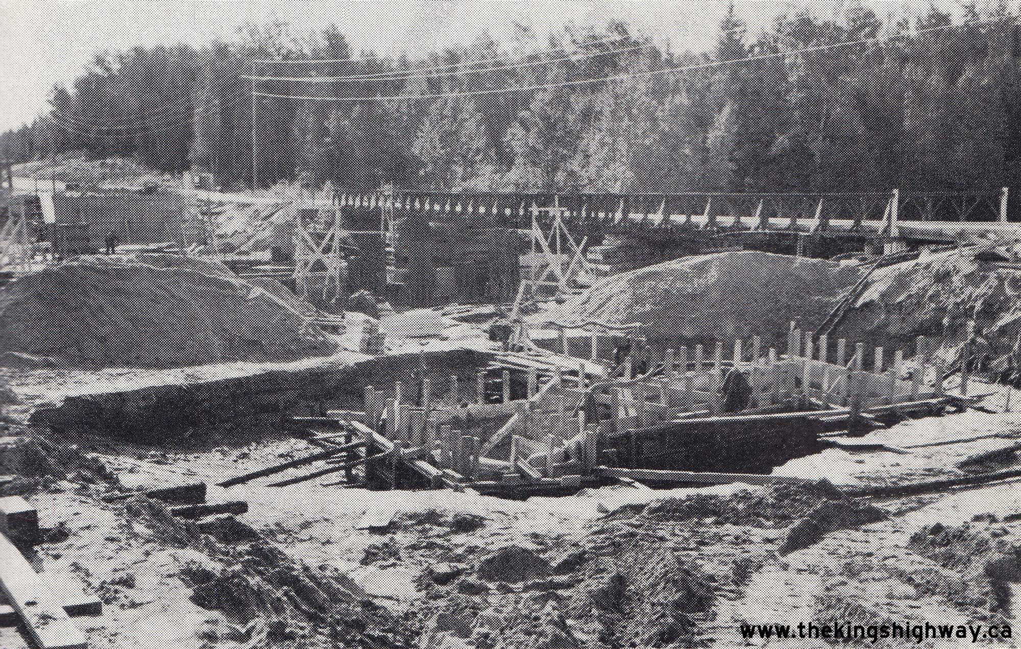 Left - Construction of the permanent White River Bridge on Hwy 17 in 1958, 14 miles north of White River. Note the temporary Hwy 17 bridge in the background.