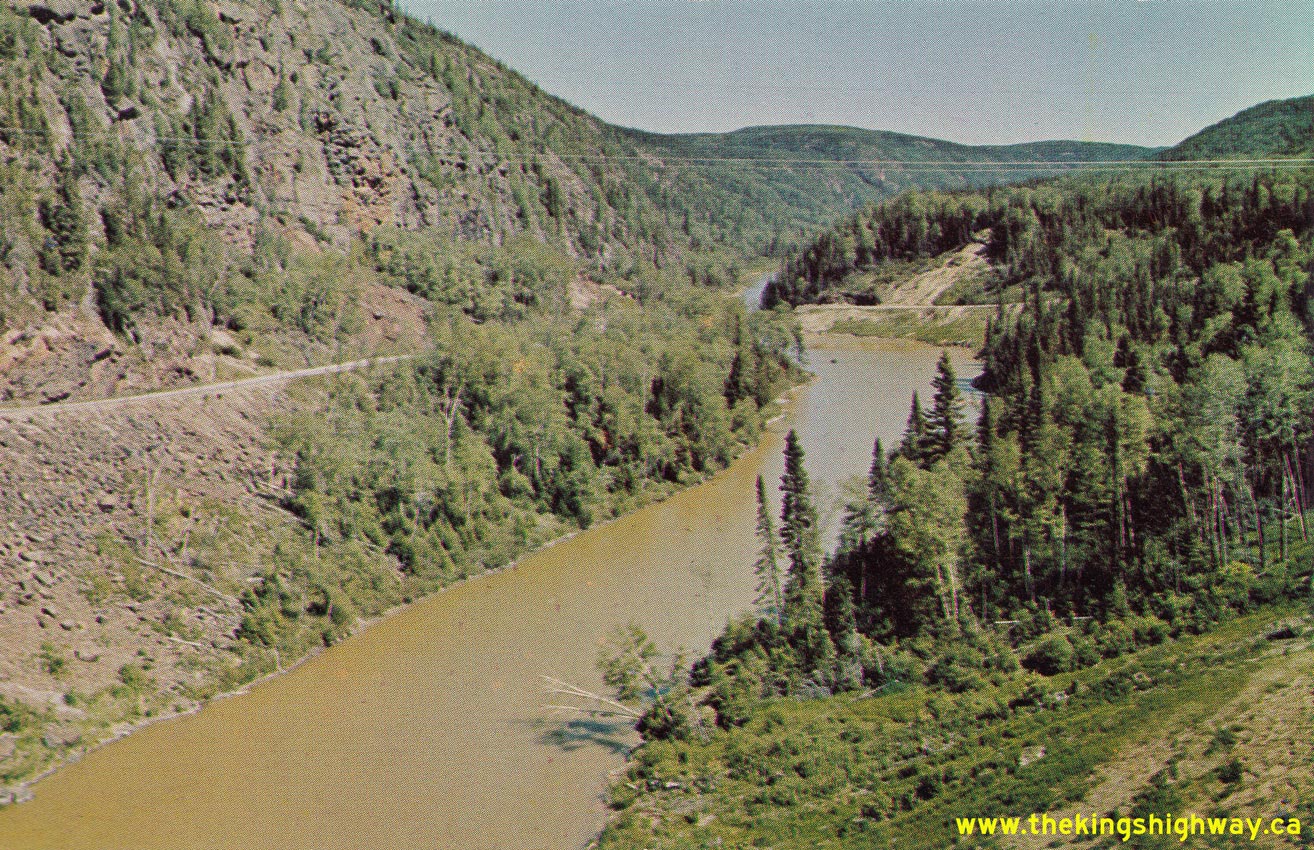 Enlarged Photo Here. Photo taken circa 1957. (Photo courtesy of Sudbury News Service Ltd, Sudbury) Right - Circa 1958 postcard view of the Little Pic River from the Hwy 17 Bridge between Marathon and Terrace Bay. Note the old alignment of Hwy 17 clinging to the cliffs at left, which led down to a temporary bridge across the Little Pic River. This former alignment of Hwy 17 was closed to traffic once the permanent Little Pic River Bridge opened to traffic in 1958. See an Enlarged Photo Here. Photo taken circa 1958. (Photo courtesy of Alex Wilson Publications Ltd, Dryden)