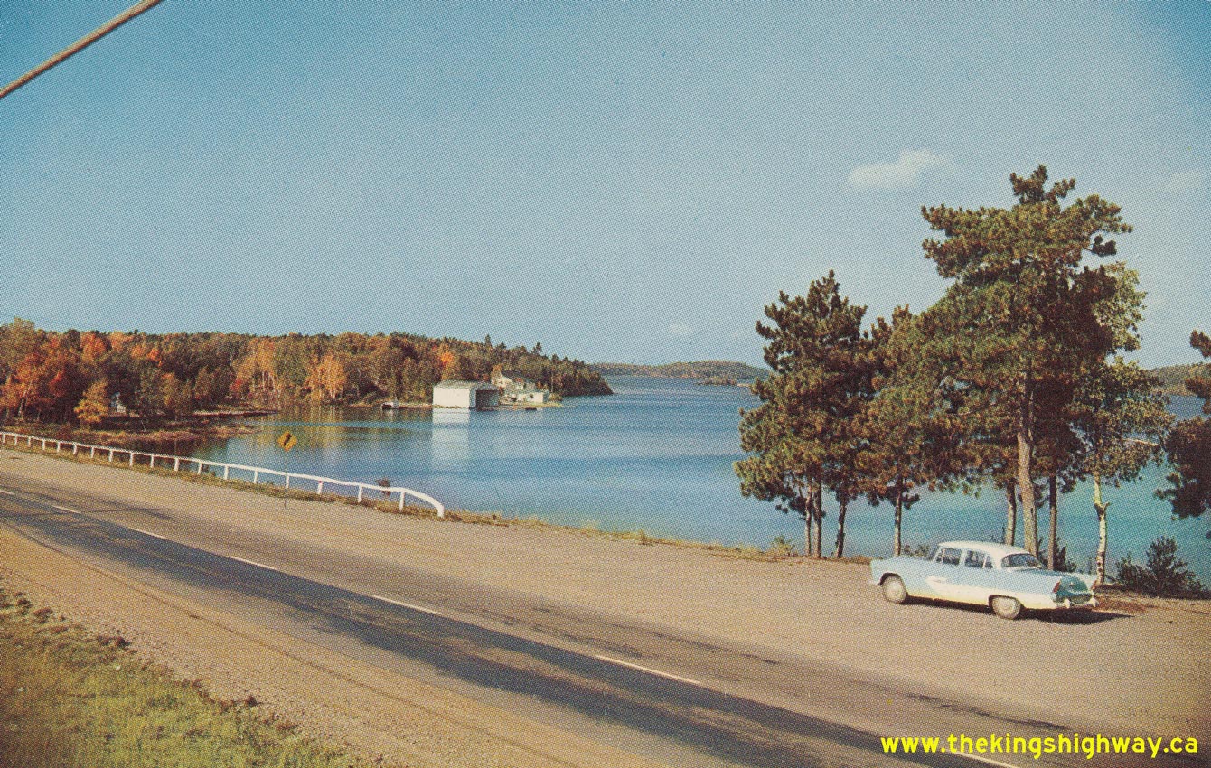 Left - Circa 1957 postcard view of Hwy 17 at Lauzon Lake, east of Blind River. See an