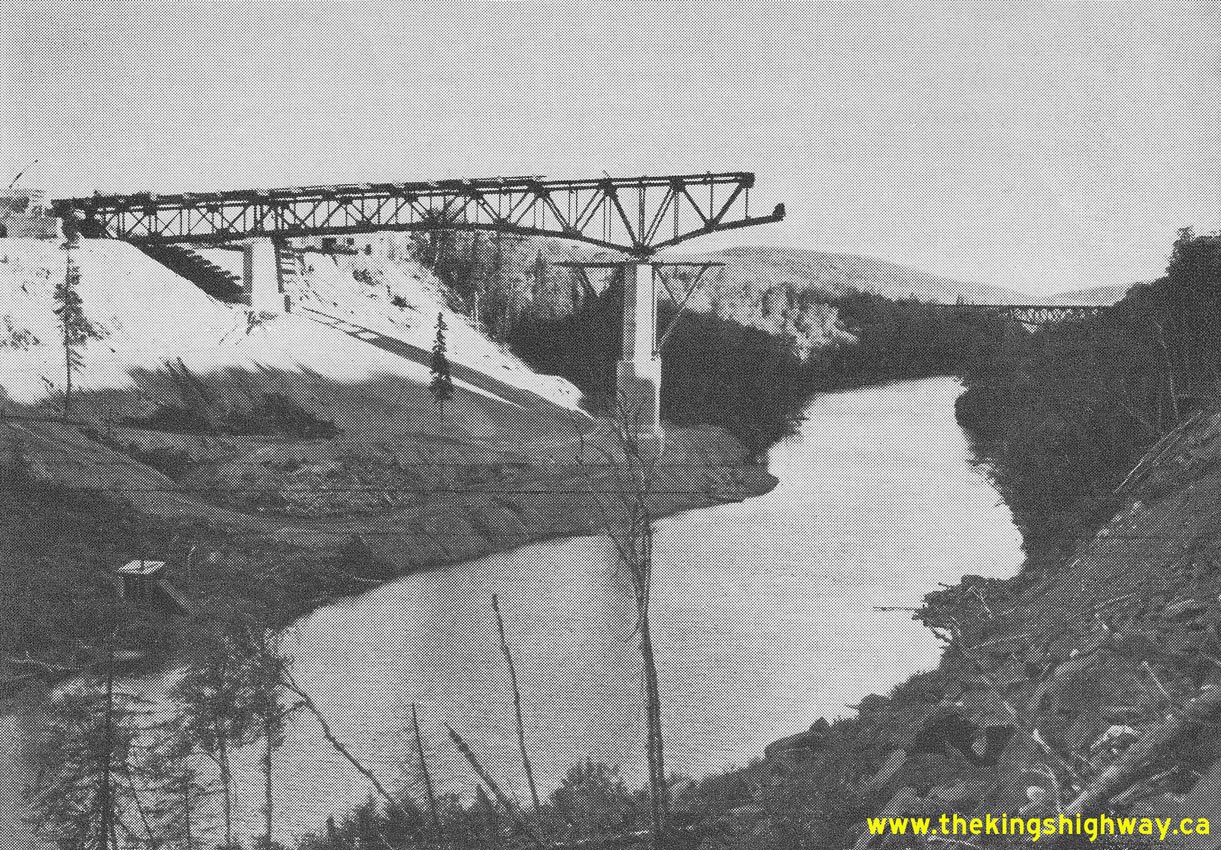 Above - Construction of the Little Pic River Bridge on Hwy 17 near Marathon. The steel deck truss portion of the bridge was about 50% complete when this photo
