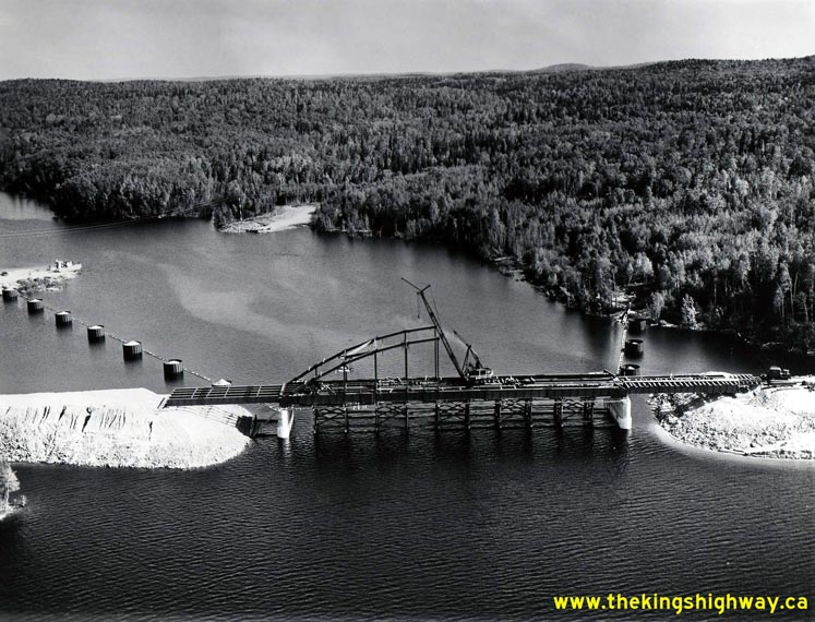 Above - Construction of the White Lake Narrows Bridge on Hwy 17 between Marathon and White River in 1959. Note the ferry operating in the background. For a
