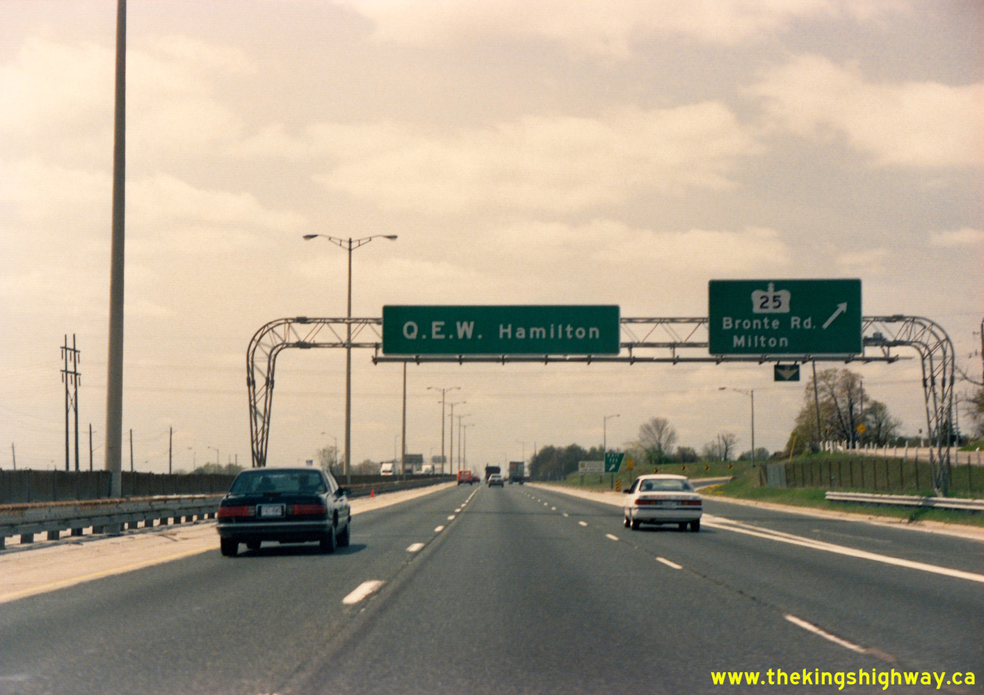 Above - Overhead freeway guide signs for the Hwy 25 (Bronte Road) Interchange on the Niagara-bound Queen Elizabeth Way in Oakville. See an