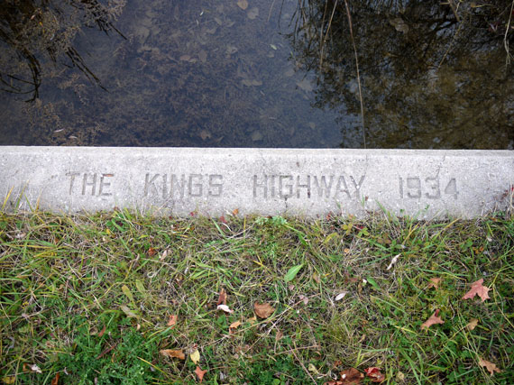 Left - Old concrete culvert on a former alignment of Hwy 26 east of Thornbury. (Photograph taken on October 16, 2009 - © Cameron Bevers) Right - Inscription on the concrete culvert on the former alignment of Hwy 26 east of Thornbury - "THE KING'S HIGHWAY 1934". (Photograph taken on October 16, 2009 - © Cameron Bevers)