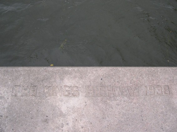 Left - Culvert inscription on Thousand Islands Parkway (Hwy 2S) "THE KING'S HIGHWAY 1938".