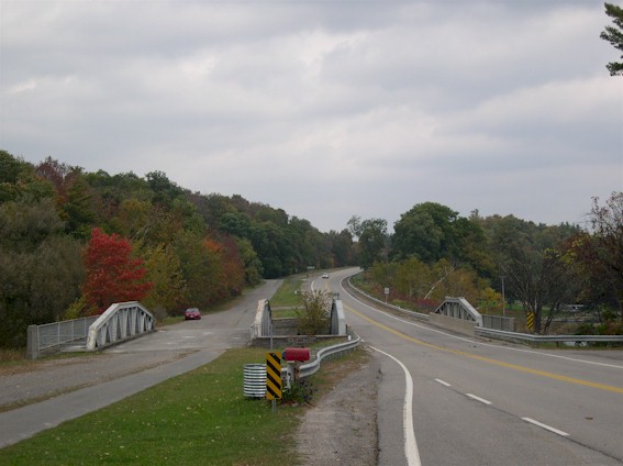 Right - Facing west towards the twin Jones Creek Bridges along the Thousand Islands Parkway. Note the abandoned right-of-way for the former westbound Hwy 2S