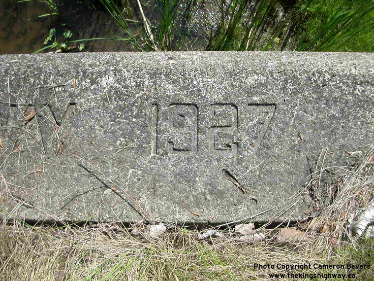 Left - Facing east along Hwy 3 towards Dunnville from Canfield. (Photograph taken on May 5, 2012 - © Cameron Bevers) Right - Inscription on an old concrete culvert near Wainfleet - "ONTARIO PROVINCIAL HIGHWAY 1927". (Photograph taken on June 22, 2003 - © Cameron Bevers)