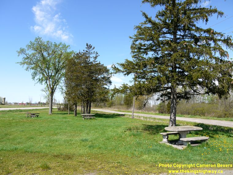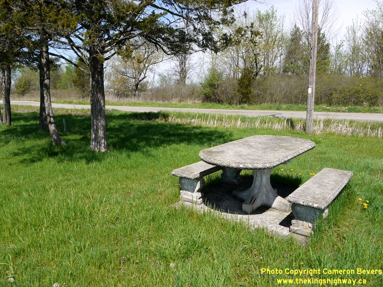 Left - Inscription on an old concrete culvert at the Canfield Roadside Park - "ONTARIO PROVINCIAL HIGHWAY 1920". (Photograph taken on May 5, 2012 - © Cameron Bevers) Right - The Canfield Roadside Park has about a half-dozen picnic tables, but it does not have washroom facilities. (Photograph taken on May 5, 2012 - © Cameron Bevers)