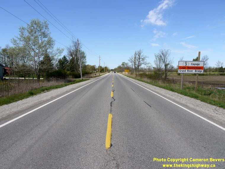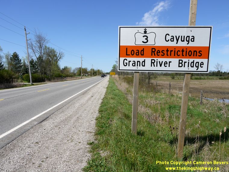 Left - Facing west along Hwy 3 towards Cayuga from Canfield. (Photograph taken on May 5, 2012 - © Cameron Bevers) Right - Advisory sign for the load limits on the Cayuga Bridge on Hwy 3. (Photograph taken on May 5, 2012 - © Cameron Bevers)
