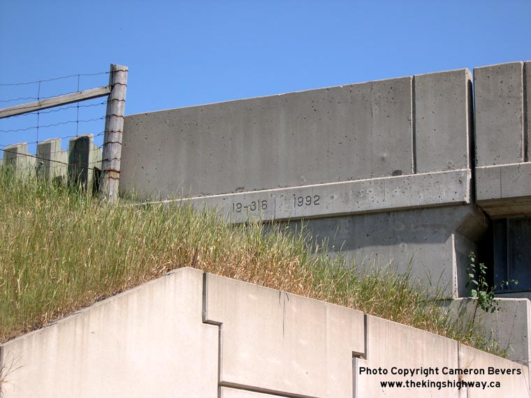Left - Pigram Road Underpass on Hwy 401 between London and Ingersoll. Structure completed in 1955. (Photograph taken on June 24, 2007 - © Cameron Bevers) Right - Structure identification number and date stamp (1992) on the Pigram Road Underpass. Like all structures carrying roadways below Hwy 401, the Pigram Road structure had to be widened when Hwy 401 was expanded to six lanes in the early 1990s. (Photograph taken on June 24, 2007 - © Cameron Bevers)