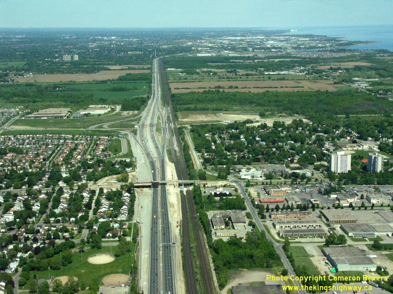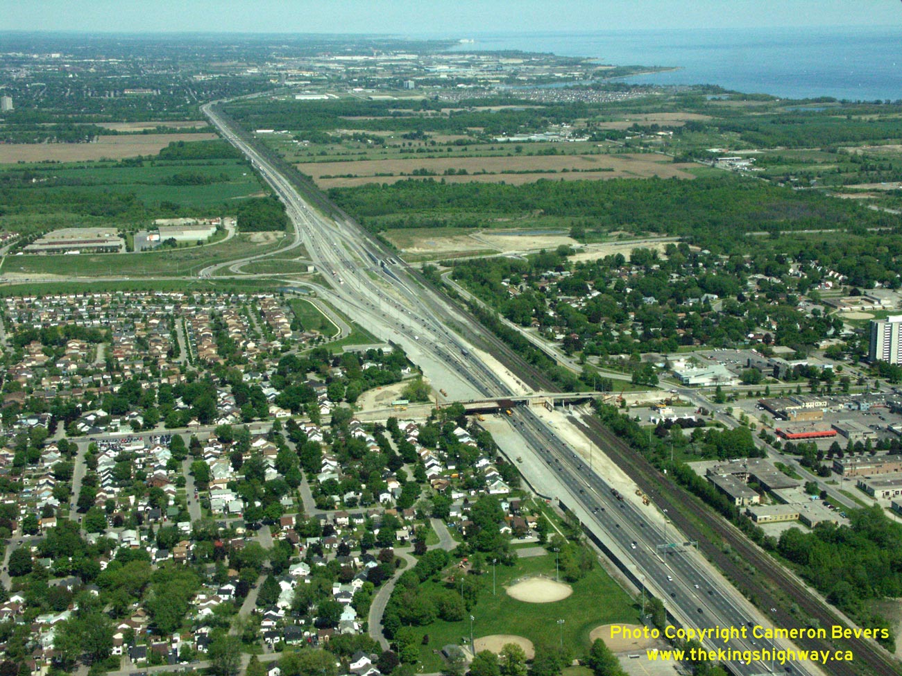 Enlarged Photo here. (Photograph taken on May 30, 2004 - © Cameron Bevers) Right - Aerial view of Hwy 401 facing east towards Harwood Avenue Overpass. See an Enlarged Photo here. (Photograph taken on May 30, 2004 - © Cameron Bevers)