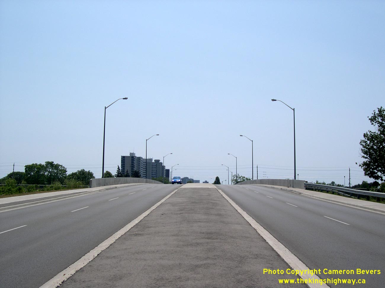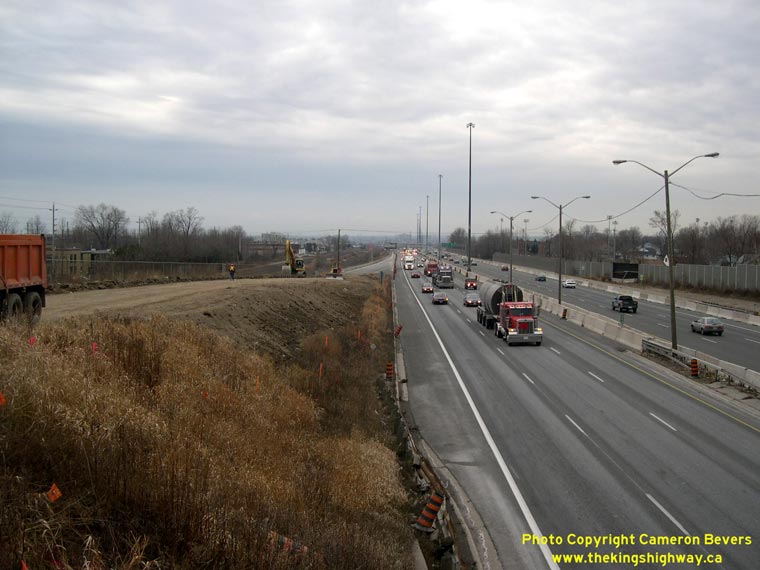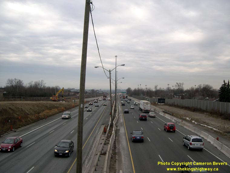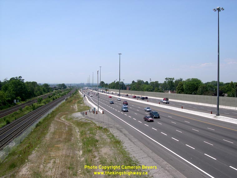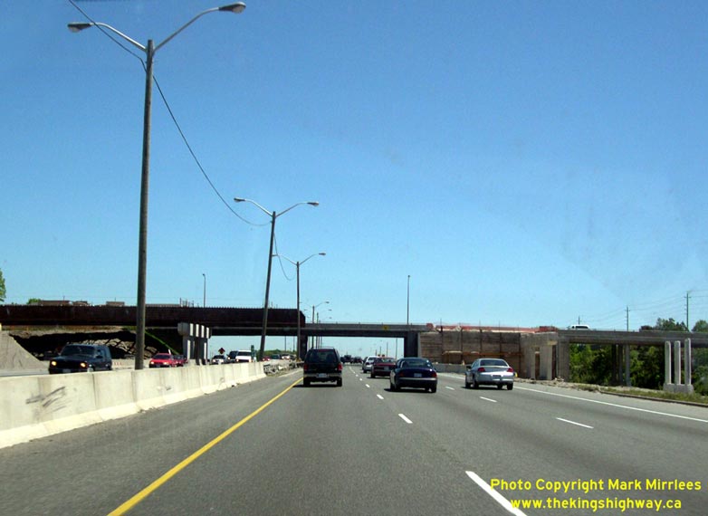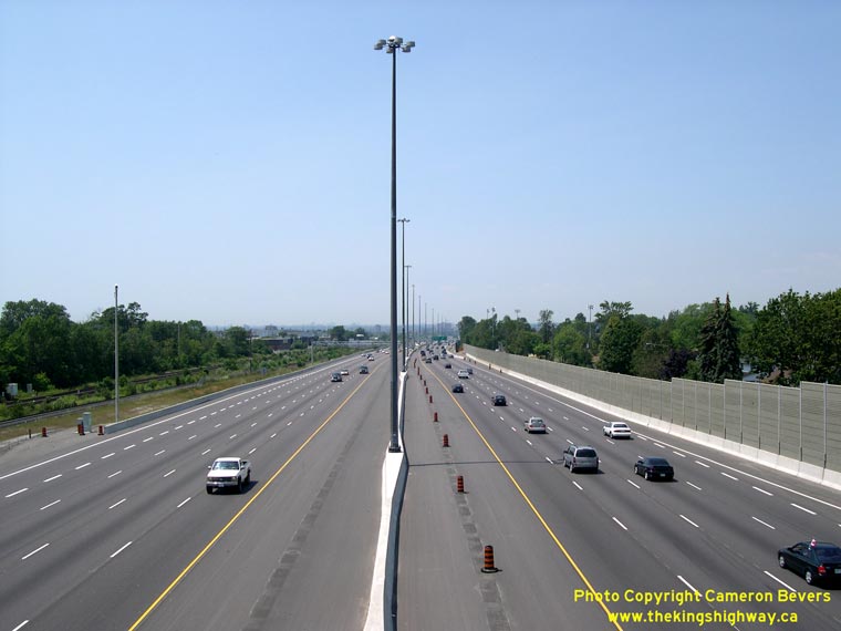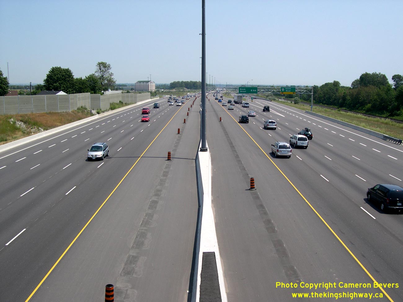 Enlarged Photo here. (Photograph taken on December 9, 2003 - © Cameron Bevers) Right - Facing east along Hwy 401 from Harwood Avenue Overpass after reconstruction. See an Enlarged Photo here. (Photograph taken on July 8, 2006 - © Cameron Bevers)