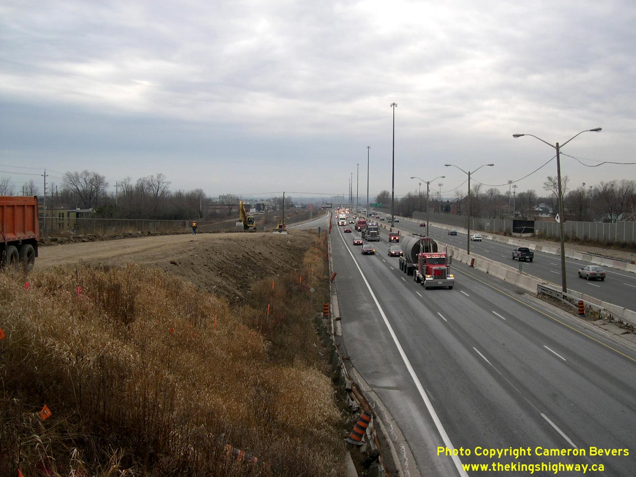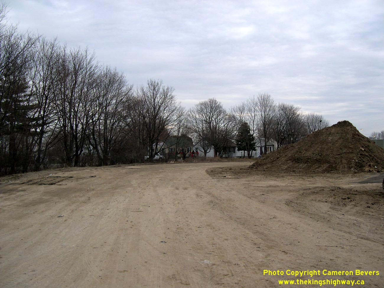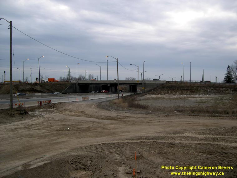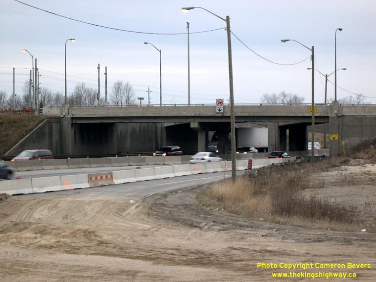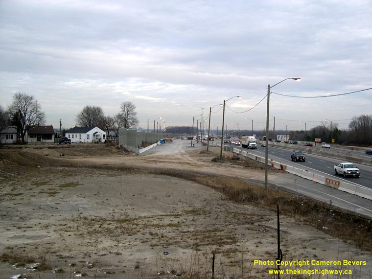 was completed in 1961. See an Enlarged Photo here. (Photograph taken on December 9, 2003 - © Cameron Bevers) Right - Demolished Harwood Avenue ramps in the northeast interchange quadrant. When the Harwood Avenue Interchange was designed in the 1930s, only a small amount of traffic was expected to use this interchange daily. As traffic volumes grew over the past few decades, the ramps at the Harwood Avenue Interchange began to exhibit serious deficiencies, particularly at peak periods. The relocated Ajax interchange at Salem Road, which opened in December 2003, has significantly longer multi-lane ramps, which can accommodate far more vehicles during peak periods. See an Enlarged Photo here. (Photograph taken on December 9, 2003 - © Cameron Bevers)