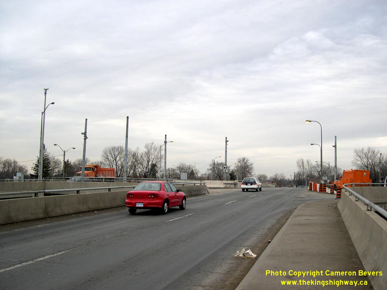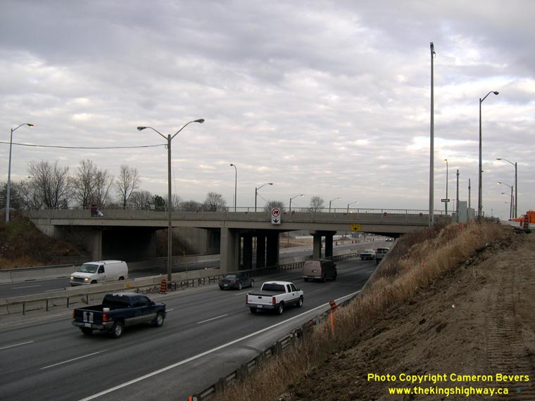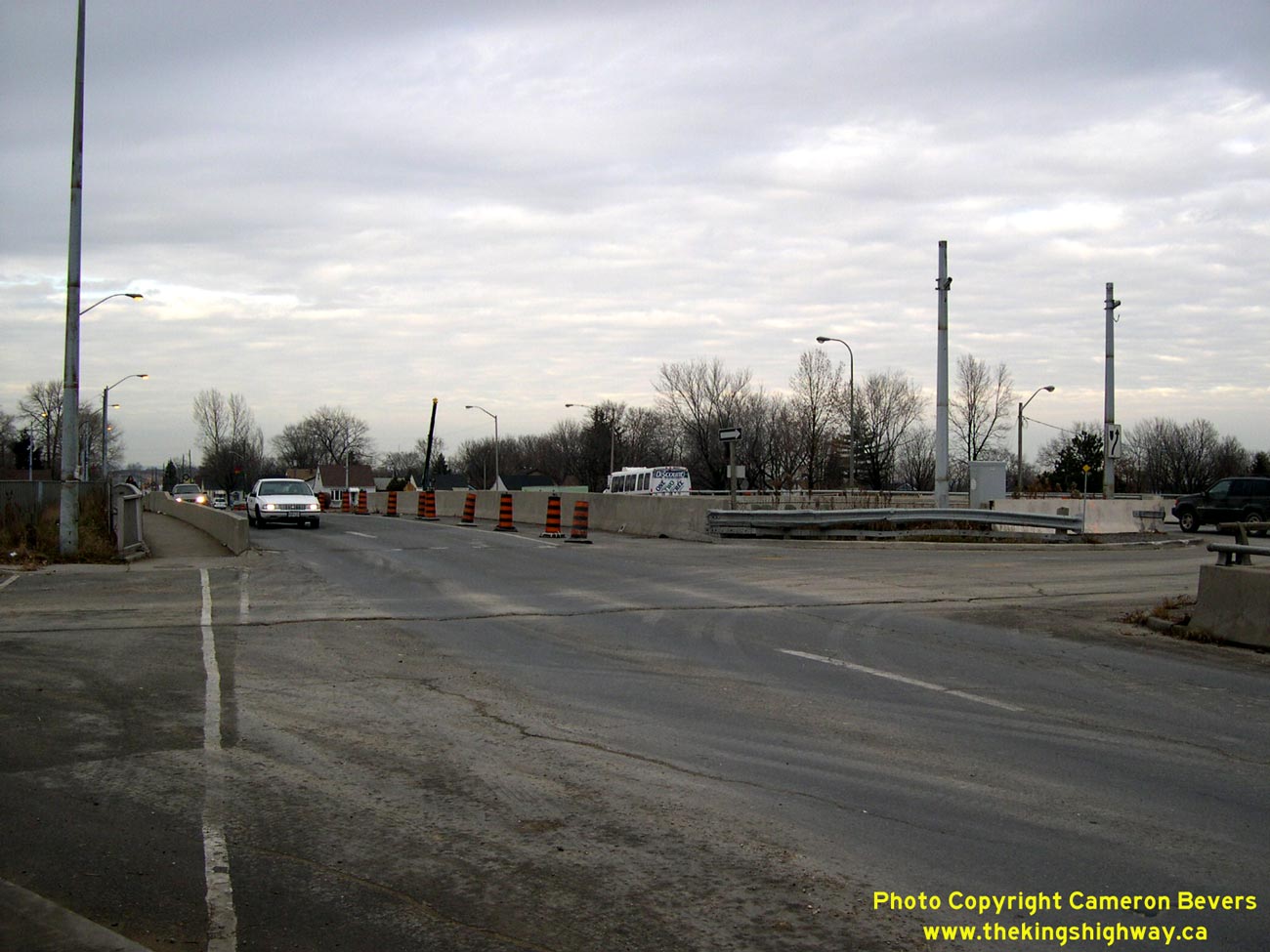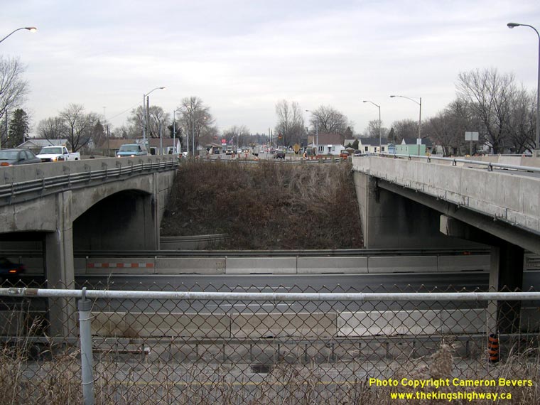 Enlarged Photo here. (Photograph taken on December 9, 2003 - © Cameron Bevers) Right - Looking south along Harwood Avenue, towards dual overpasses across Hwy 401. See an Enlarged Photo here. (Photograph taken on December 9, 2003 - © Cameron Bevers)