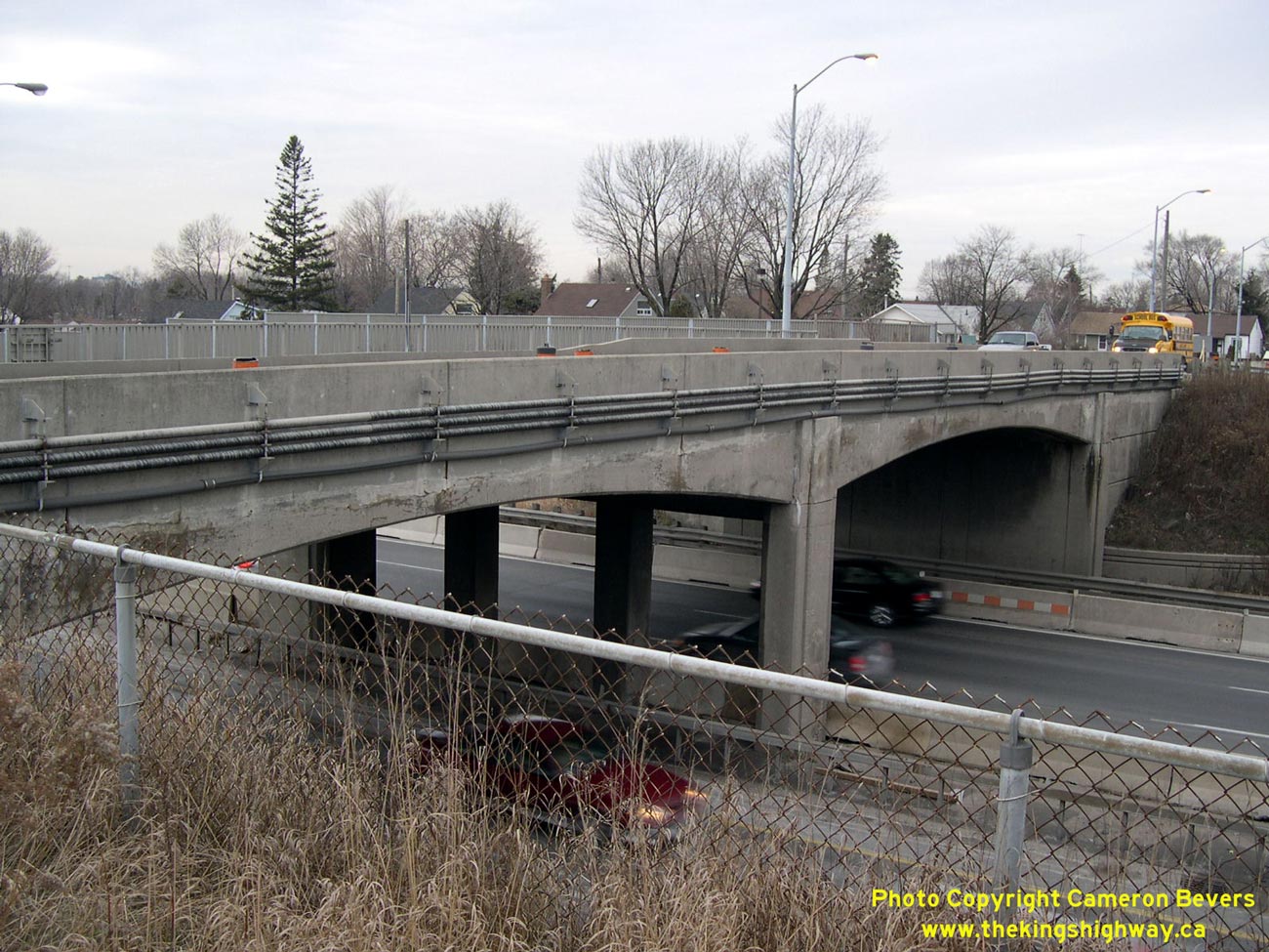 Enlarged Photo here. (Photograph taken on December 9, 2003 - © Cameron Bevers) Right - Eastern side of southbound (1941) Harwood Avenue Overpass over Hwy 401, looking north. Both of the dual Harwood Avenue Overpasses were demolished in 2004 in order to widen the highway underneath. See an Enlarged Photo here. (Photograph taken on December 9, 2003 - © Cameron Bevers)