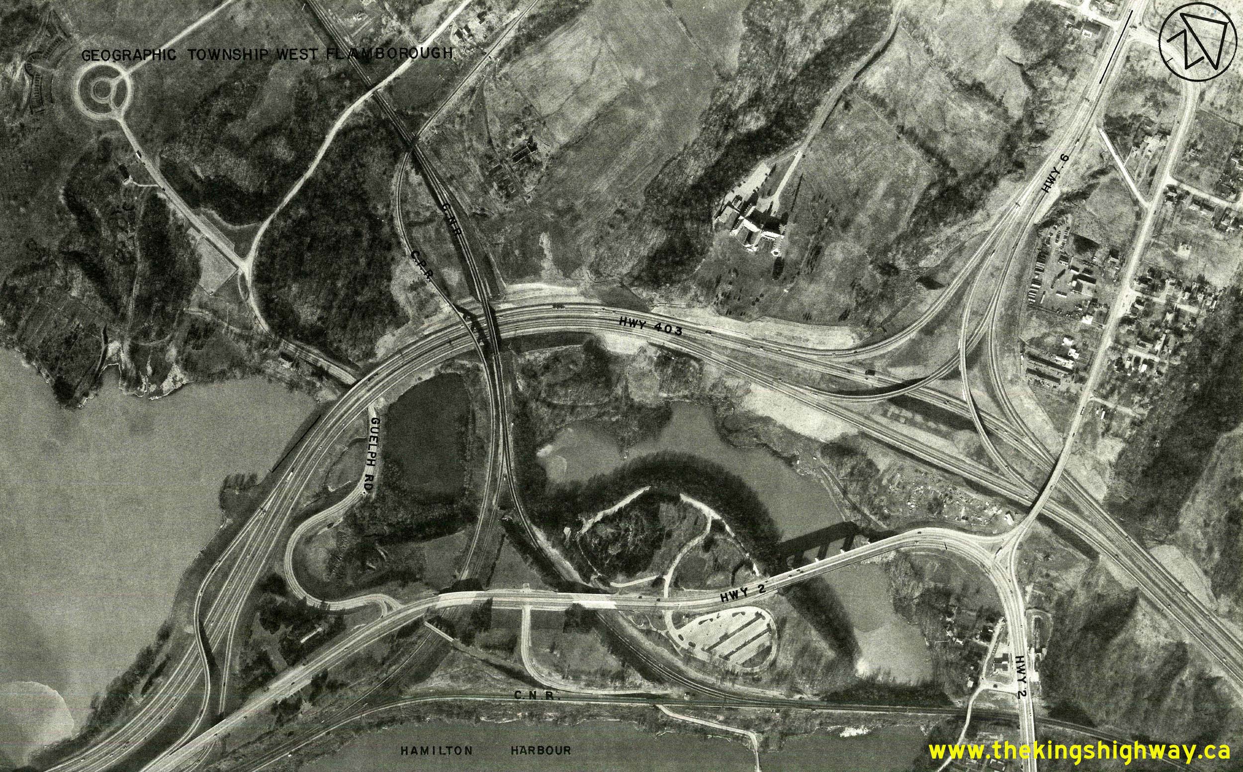 Above - Aerial view of the Hwy 2 & Hwy 403 Interchange west of Ancaster in 1974. This "trumpet" interchange marked the western terminus of the