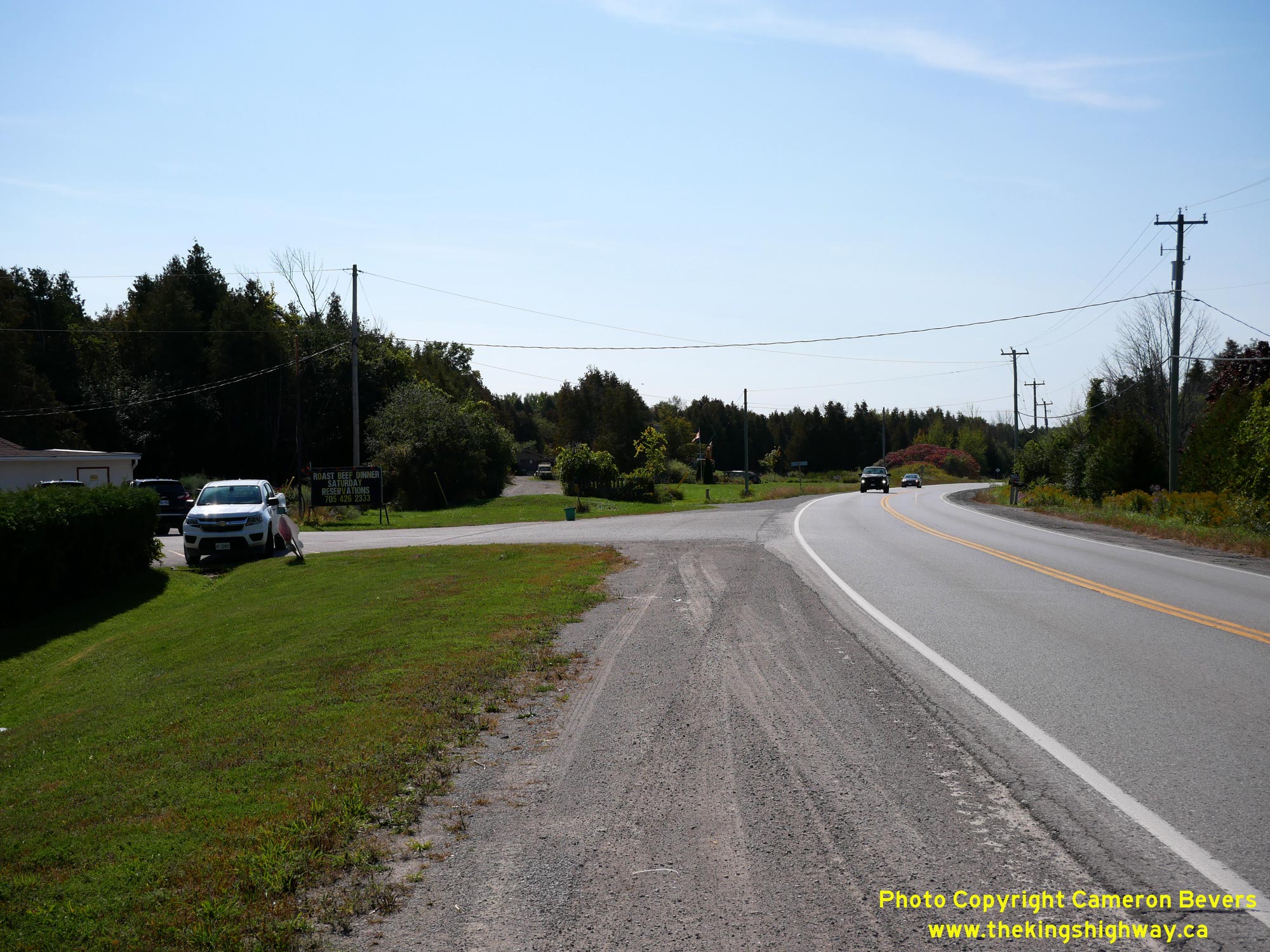 motorists from driving over the closed part of the old highway. See an Enlarged Photo Here. (Photograph taken on September 22, 2023 - © Cameron Bevers) Right - Facing south along Old Hwy 12 (Sideroad 17) from Old Hwy 48 (Durham Road 23). The roadside business at right is called "At the Y" - a most appropriate name indeed, given the intersection's layout. Historically, Hwy 12 and Hwy 48 joined at such an acute angle that it would have been virtually impossible for a long truck to make the turn from northbound Hwy 48 to southbound Hwy 12, or vice-versa. Therefore, it is little wonder that the DHO made a point of relocating Hwy 48 onto a new route south of Beaverton to avoid this problematic Y-junction. See an Enlarged Photo Here. (Photograph taken on September 22, 2023 - © Cameron Bevers)