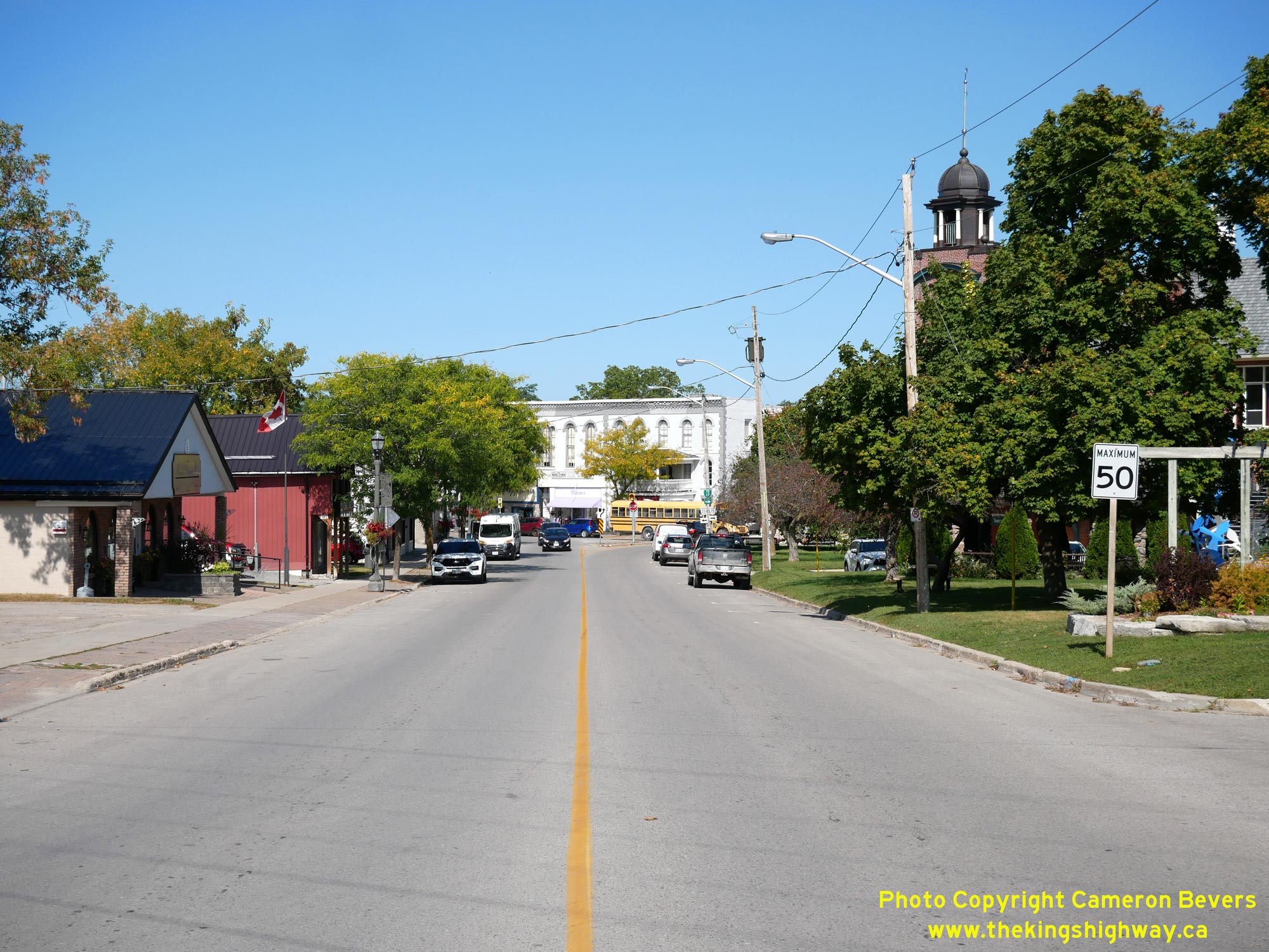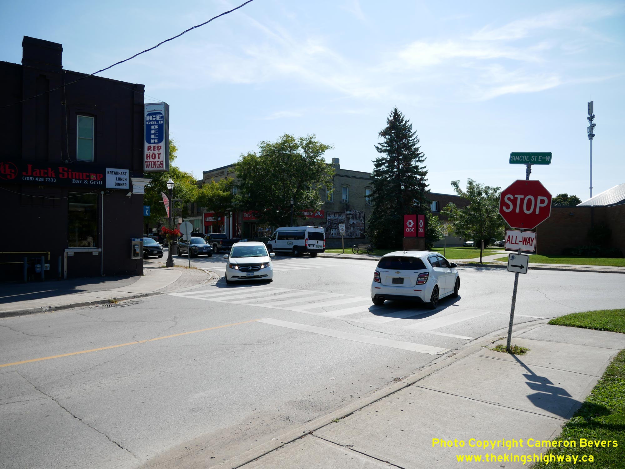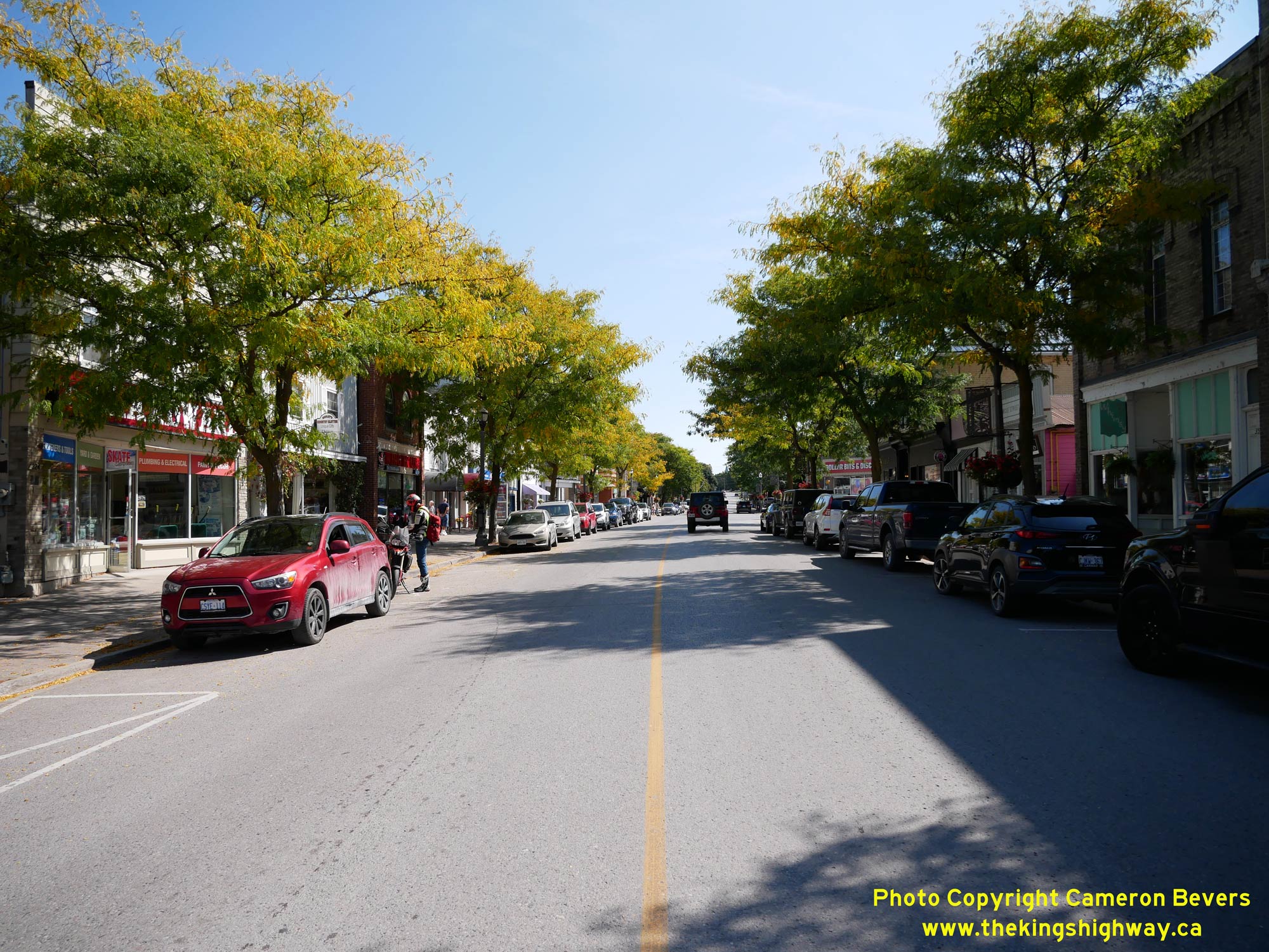 follow Hwy 48 south to Sutton, Markham and Toronto. See an Enlarged Photo Here. (Photograph taken on September 22, 2023 - © Cameron Bevers) Right - View of Downtown Beaverton on Simcoe Street (Old Hwy 12 & Old Hwy 48), facing east towards Osborne Street. Prior to the completion of the Beaverton Bypass in 1966, southbound traffic on Hwy 12 & Hwy 48 would have turned right just ahead onto Osborne Street. See an Enlarged Photo Here. (Photograph taken on September 22, 2023 - © Cameron Bevers)