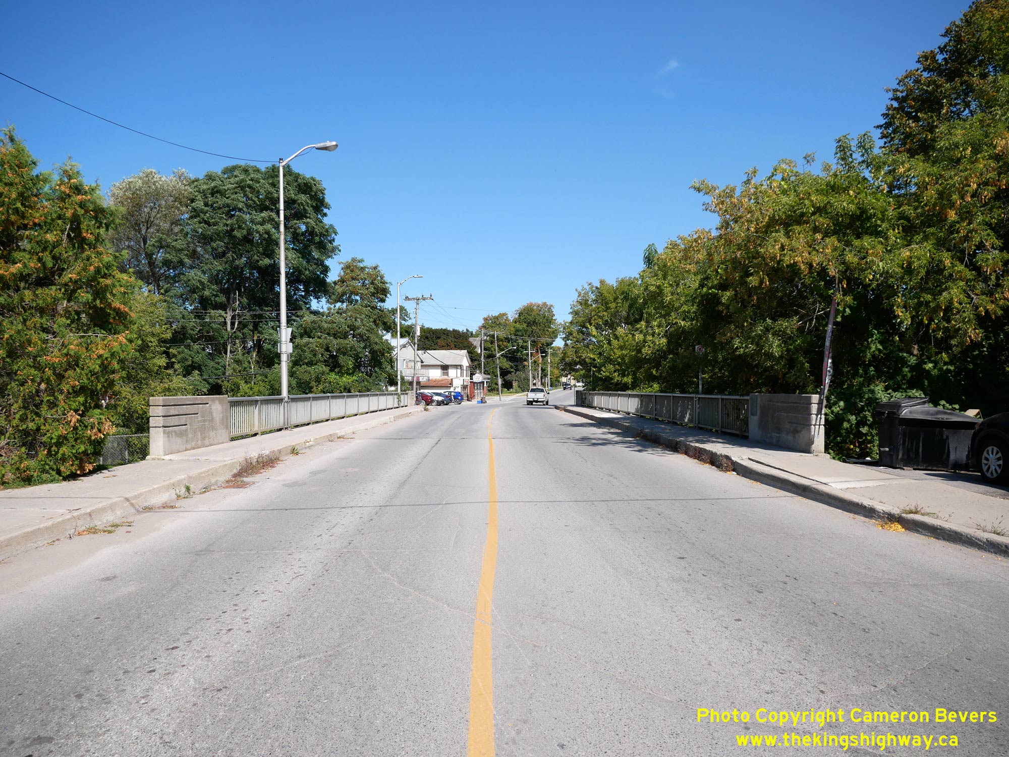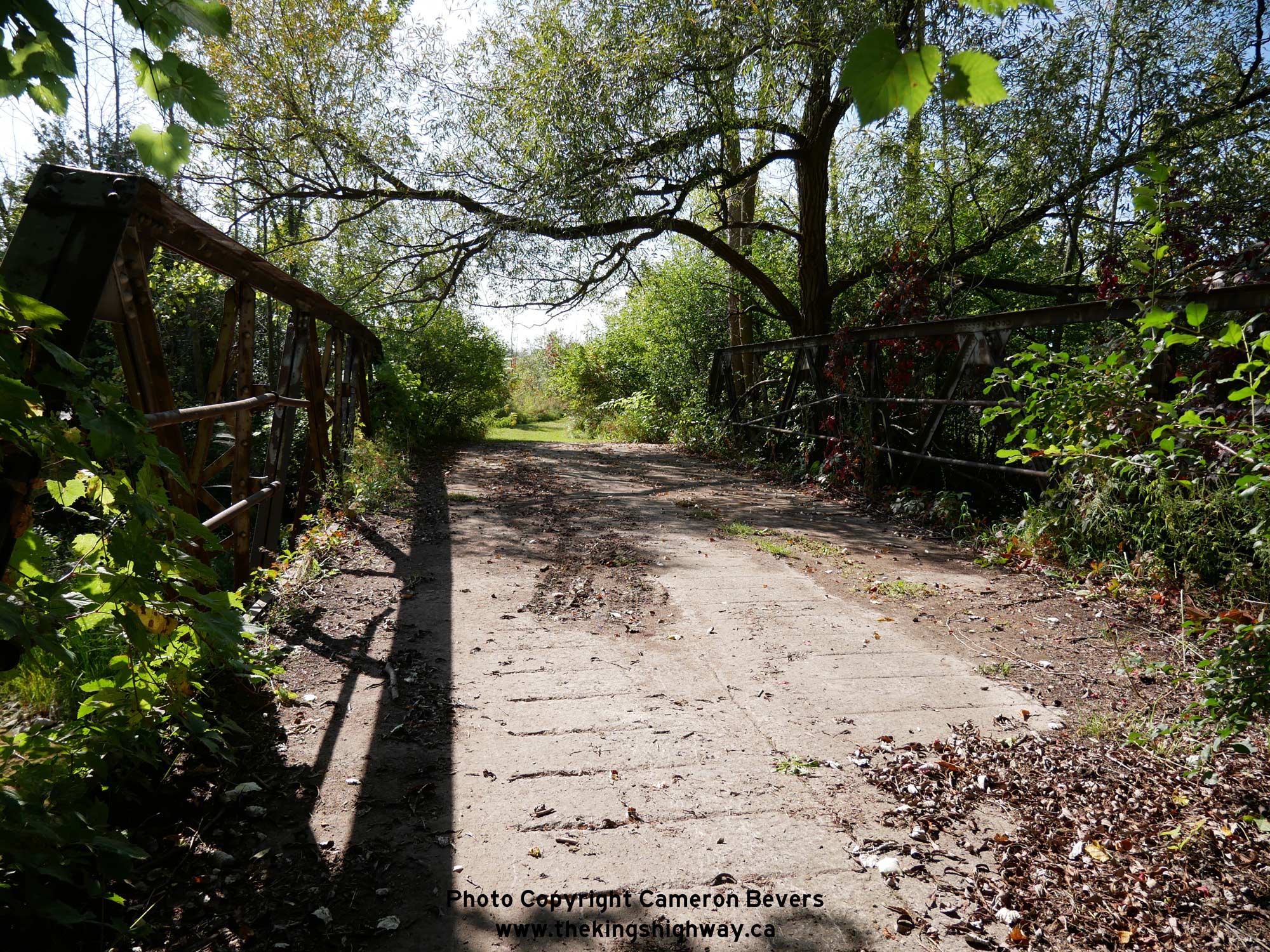 order to allow for off-tracking for turning vehicles. See an Enlarged Photo Here. (Photograph taken on September 22, 2023 - © Cameron Bevers) Right - View of Old Hwy 12 & Old Hwy 48 (Mara Road), facing north from the Beaverton River Bridge. The overhead truss of the old Beaverton River Bridge would have posed a sight distance constraint for adjacent streets and driveways. While concrete bowstring arch bridges are quite beautiful, then can also be rather impractical in an urban setting. See an Enlarged Photo Here. (Photograph taken on September 22, 2023 - © Cameron Bevers)