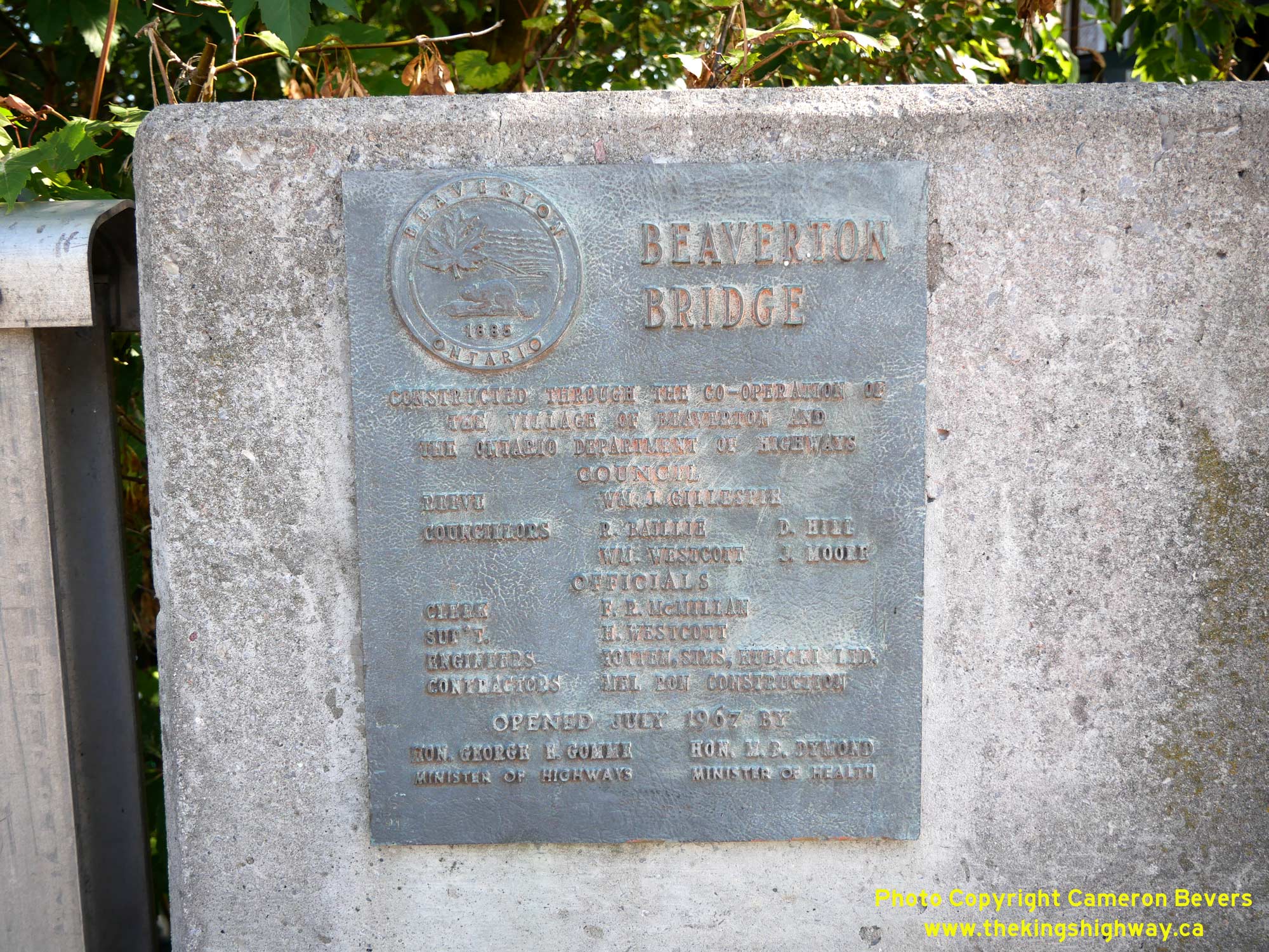 Left - Plaque commemorating the completion of the new Beaverton River Bridge in 1967. It is interesting to note that the new bridge was officially opened to