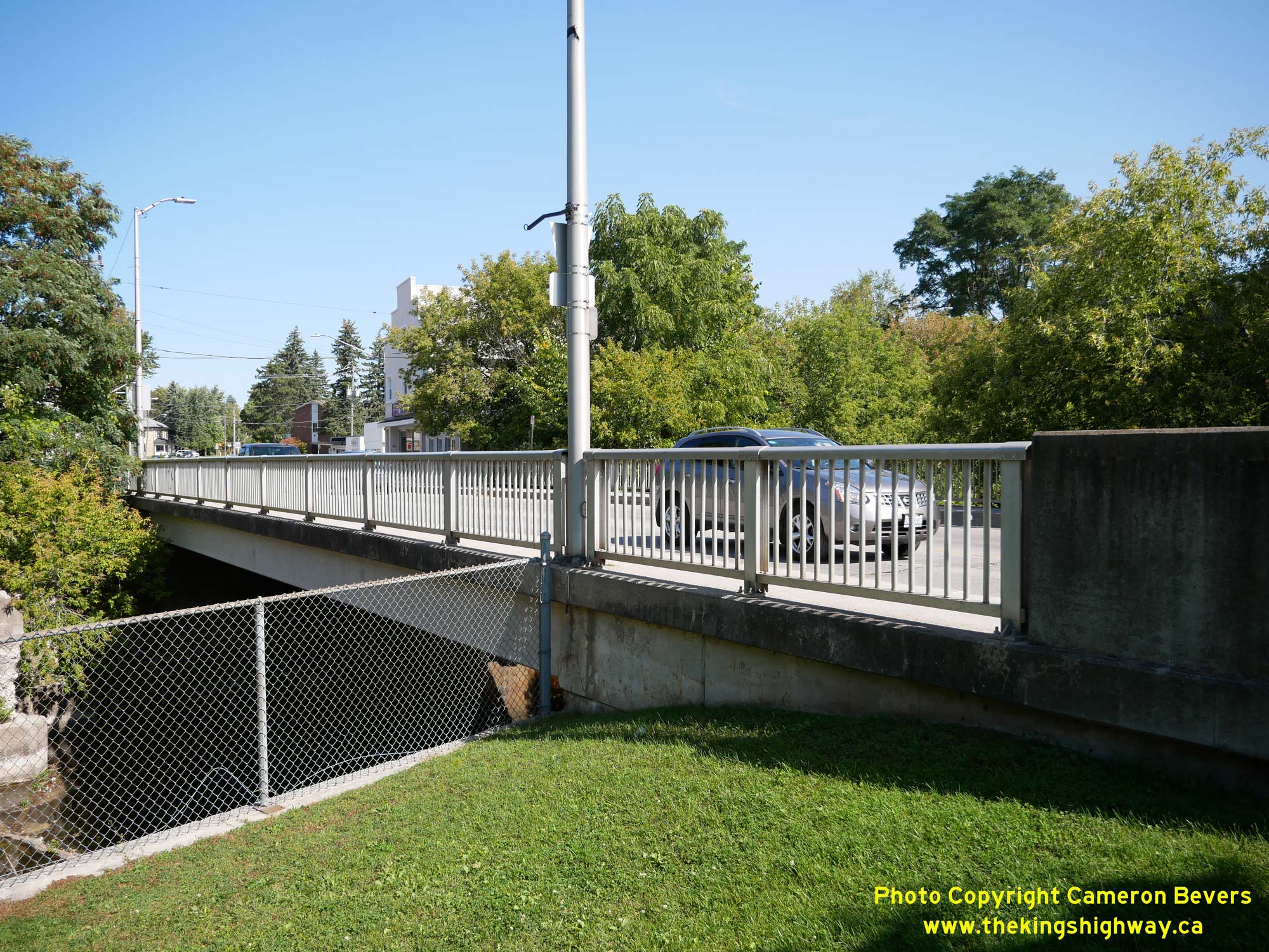 Enlarged Photo Here. (Photograph taken on September 22, 2023 - © Cameron Bevers) Right - View of the intersection of Mara Road and Simcoe Street in Beaverton. Prior to the completion of the Beaverton Bypass in 1966, traffic using Hwy 12 & Hwy 48 had to turn onto Beaverton's main street at a very constrained urban intersection. With the overhead arches of the adjacent concrete truss bridge even further constraining the roadway width to the north, it is quite remarkable that long trucks were even able to make this turn at all! Those that did make the turn likely had considerable difficulty and would have had to do so at a very low speed. While some of Ontario's historical traffic bottlenecks were quite obvious, other bottlenecks like this example were a lot more subtle - but were nevertheless problematic. See an Enlarged Photo Here. (Photograph taken on September 22, 2023 - © Cameron Bevers)