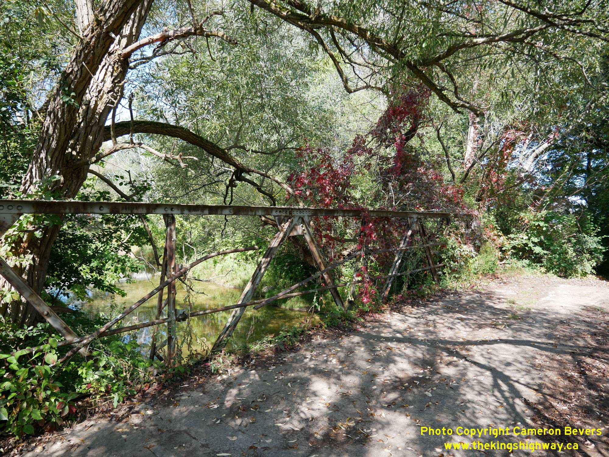 Enlarged Photo Here. (Photograph taken on September 22, 2023 - © Cameron Bevers) Right - The old bridge over White's Creek is a single-span steel truss (Warren type) structure. The exact age of this bridge is unknown, but it is believed to have been constructed around 1915. The bridge last carried Hwy 12 traffic in 1930, when a new bridge was built on the provincial highway over White's Creek a short distance downstream. See an Enlarged Photo Here. (Photograph taken on September 22, 2023 - © Cameron Bevers)