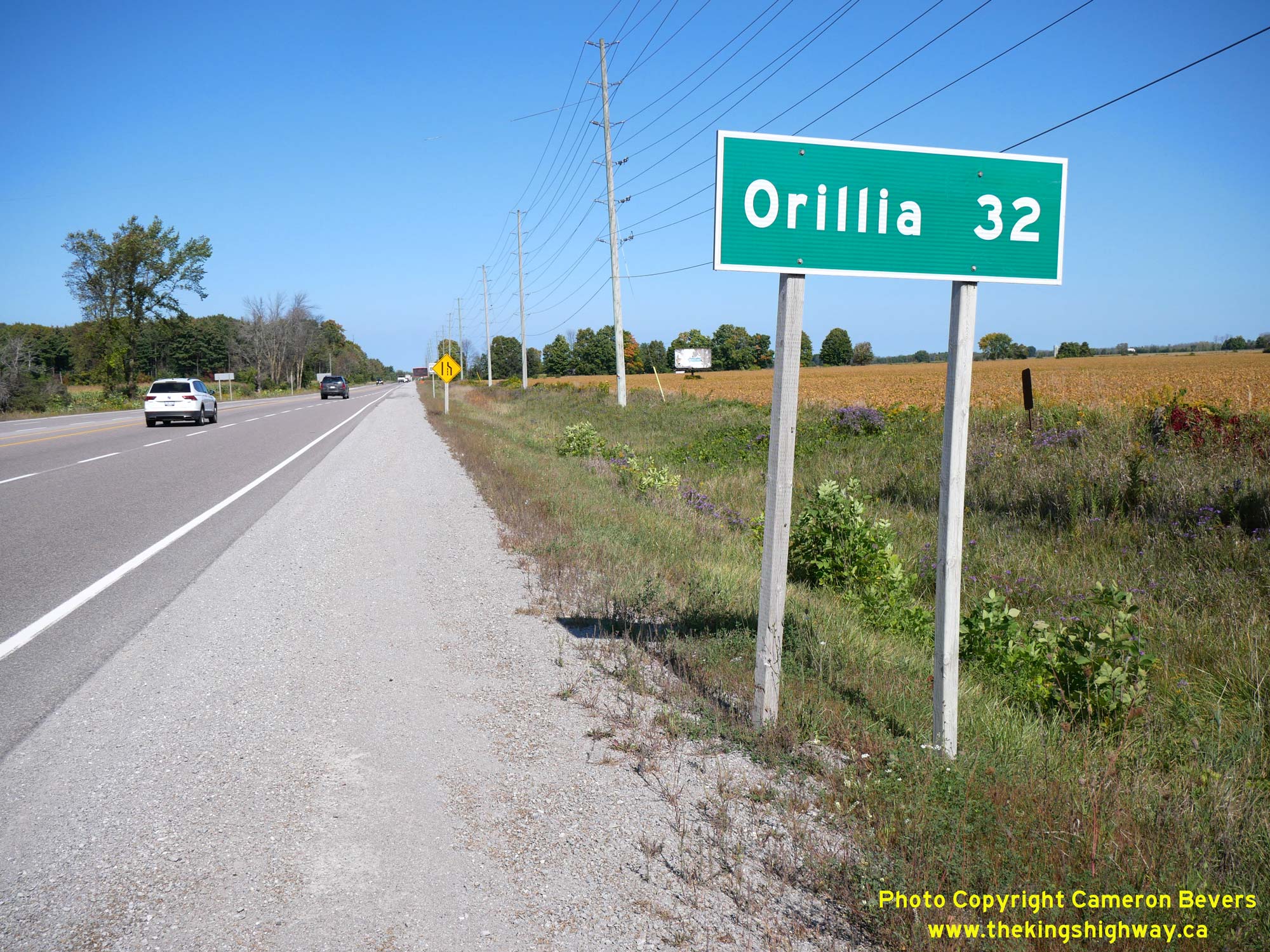 Enlarged Photo Here. (Photograph taken on September 22, 2023 - © Cameron Bevers) Right - Facing north along Hwy 12 & Hwy 48 from Mara Road (Old Hwy 12 & Old Hwy 48). The former curved diversion coming from Beaverton once joined in at left, just beyond the woodlot. The completion of the Beaverton Bypass in 1966 reduced the highway distance between Whitby and Orillia by about 2 1/2 miles (4 km). See an Enlarged Photo Here. (Photograph taken on September 22, 2023 - © Cameron Bevers)
