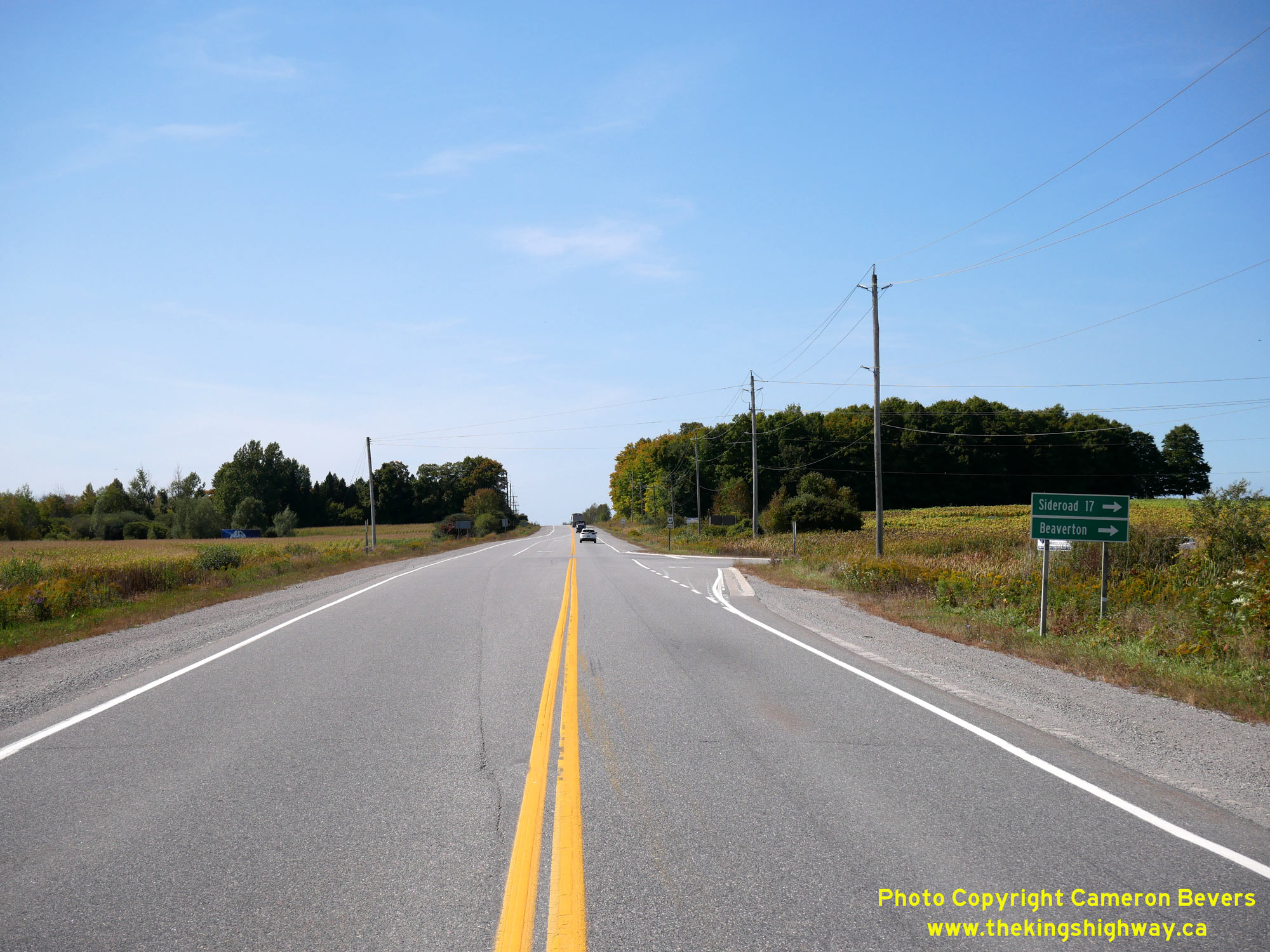 became a part of Hwy 48. See an Enlarged Photo Here. (Photograph taken on September 22, 2023 - © Cameron Bevers) Right - View of Hwy 48 facing north from the Old Hwy 12 Junction at Sideroad 17. Hwy 48 continues north for about 3 km where it meets the relocated route of Hwy 12 at the Beaverton Bypass. This section of Hwy 48 between Sideroad 17 and the Beaverton Bypass was actually a part of Hwy 12 from 1927 up until 1966. See an Enlarged Photo Here. (Photograph taken on September 22, 2023 - © Cameron Bevers)
