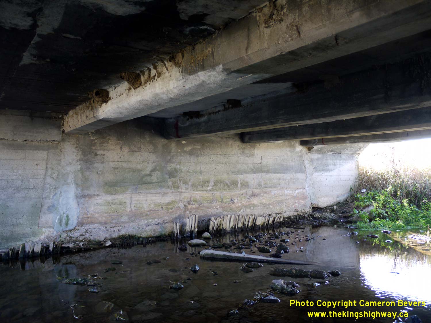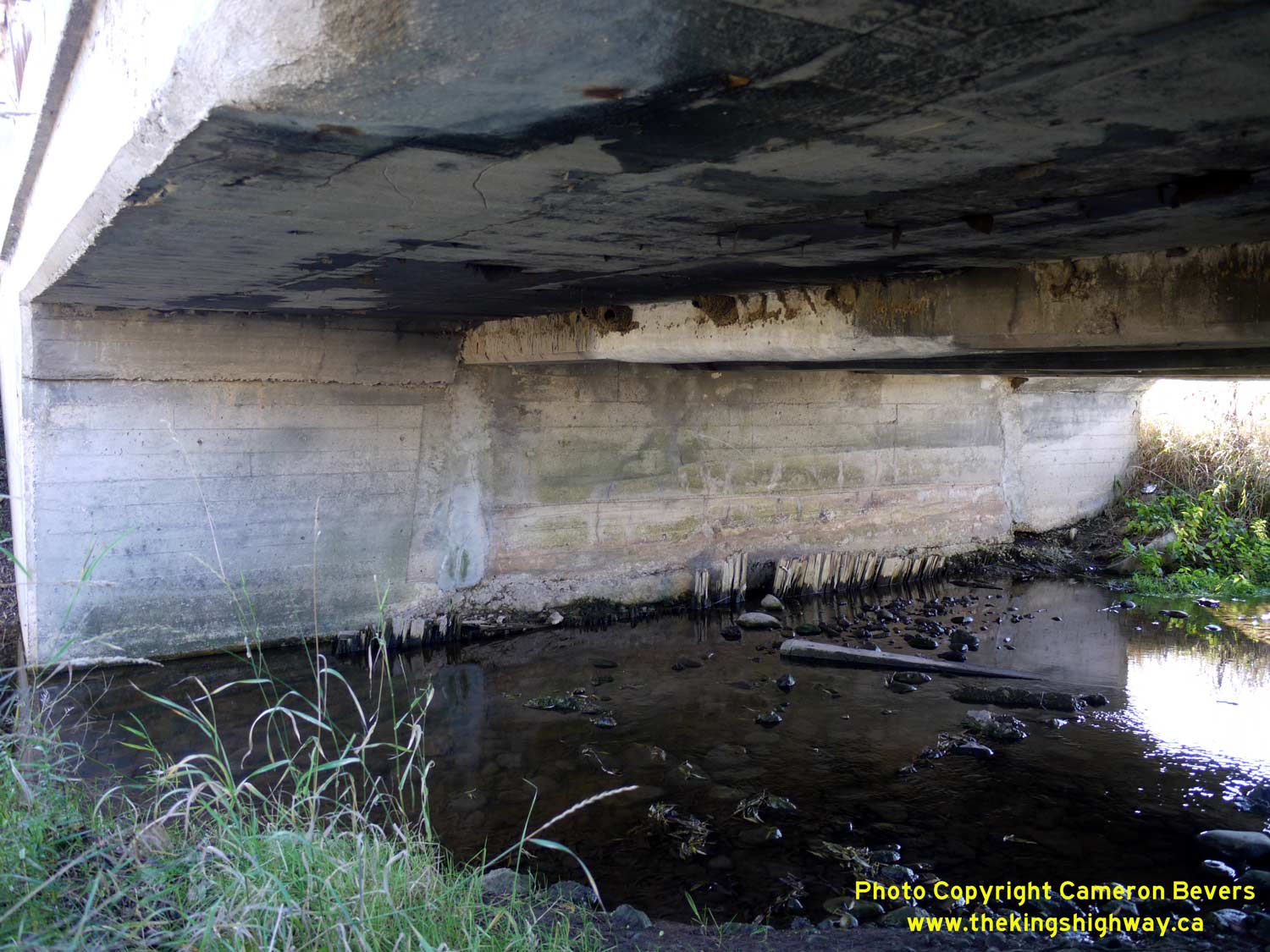 extensions. See an Enlarged Photo Here. (Photograph taken on November 10, 2009 - © Cameron Bevers) Right - Close-up of the older cast-in-place concrete beams of the original Signet Creek Bridge. The construction date of the original bridge is unknown, but it is believed to have been built in the 1920s. The newer extensions on either side of the original structure were built during a bridge widening project which took place in 1960. See an Enlarged Photo Here. (Photograph taken on November 10, 2009 - © Cameron Bevers)