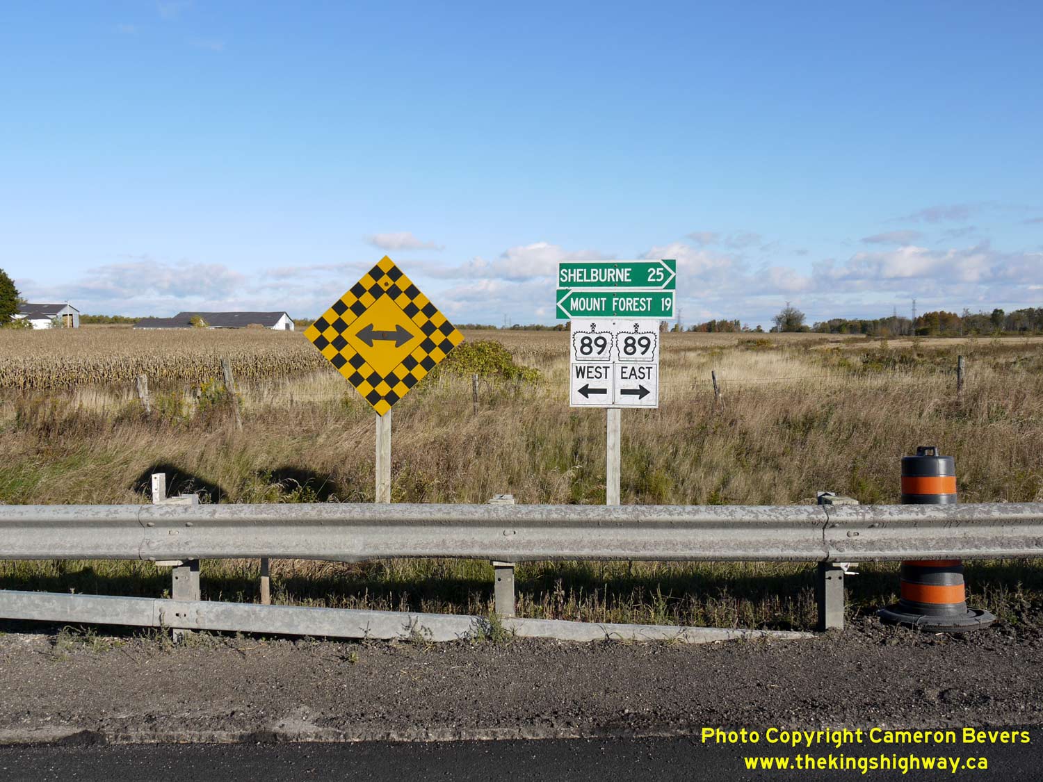 Enlarged Photo Here. (Photograph taken on November 10, 2009 - © Cameron Bevers) Right - Junction sign assembly at the Hwy 89 and County Road 16 Junction between Mount Forest and Shelburne. See an Enlarged Photo Here. (Photograph taken on November 10, 2009 - © Cameron Bevers)