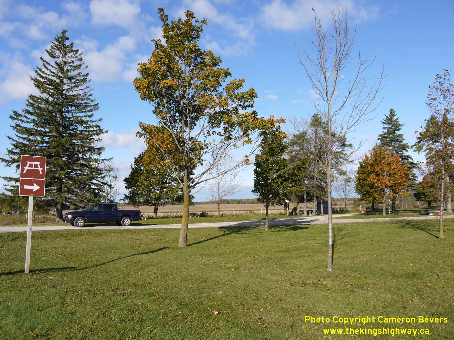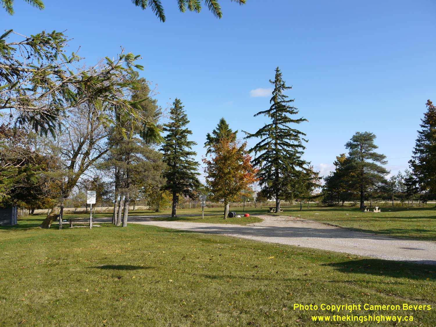 blue-and-white. See an Enlarged Photo Here. (Photograph taken on November 10, 2009 - © Cameron Bevers) Right - View of the Southgate Township Roadside Park on Hwy 89. This roadside park is situated on the former site of a rural schoolhouse, which was acquired by the DHO in 1966. This is one of two roadside parks located along Hwy 89. The other park is situated between Primrose and Alliston just west of the Dufferin County Road 18 (Airport Road) Junction. See an Enlarged Photo Here. (Photograph taken on November 10, 2009 - © Cameron Bevers)