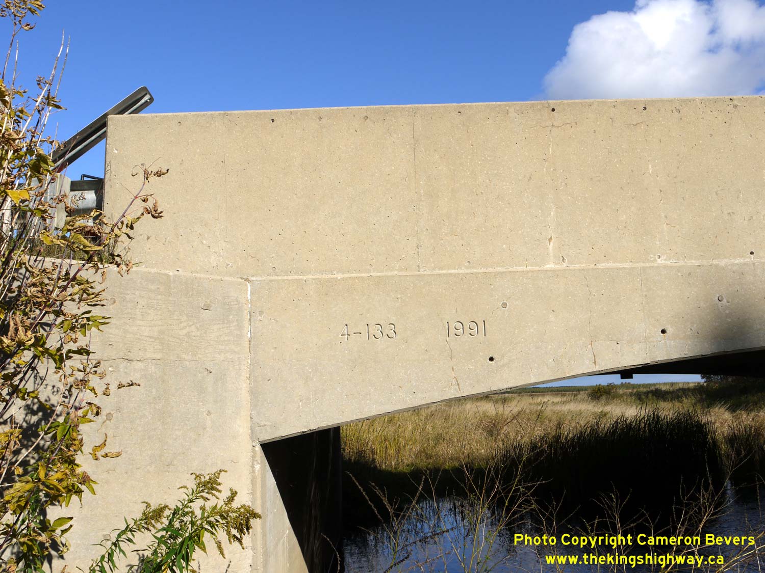 Maitland. See an Enlarged Photo Here. (Photograph taken on November 10, 2009 - © Cameron Bevers) Right - Structure identification number and date stamp (1991) on the Grand River Bridge on Hwy 89 at Keldon. The date stamp refers to the last widening and rehabilitation of the bridge and not the bridge's original construction date of 1942. See an Enlarged Photo Here. (Photograph taken on November 10, 2009 - © Cameron Bevers)