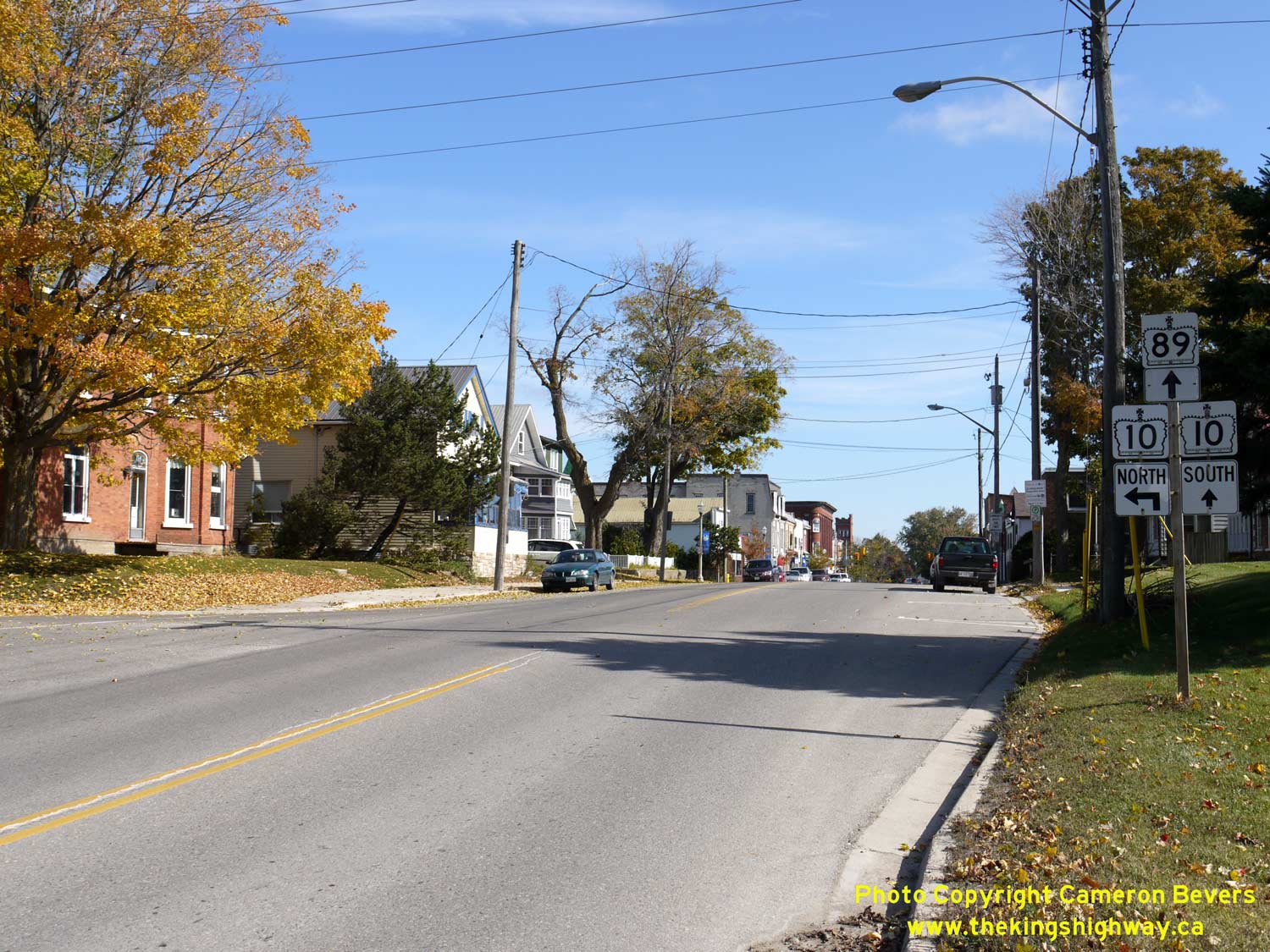 must turn right at Owen Sound Street. As the street name implies, Hwy 10 heads northwest to Owen Sound. Hwy 89 continues straight ahead on its route west towards