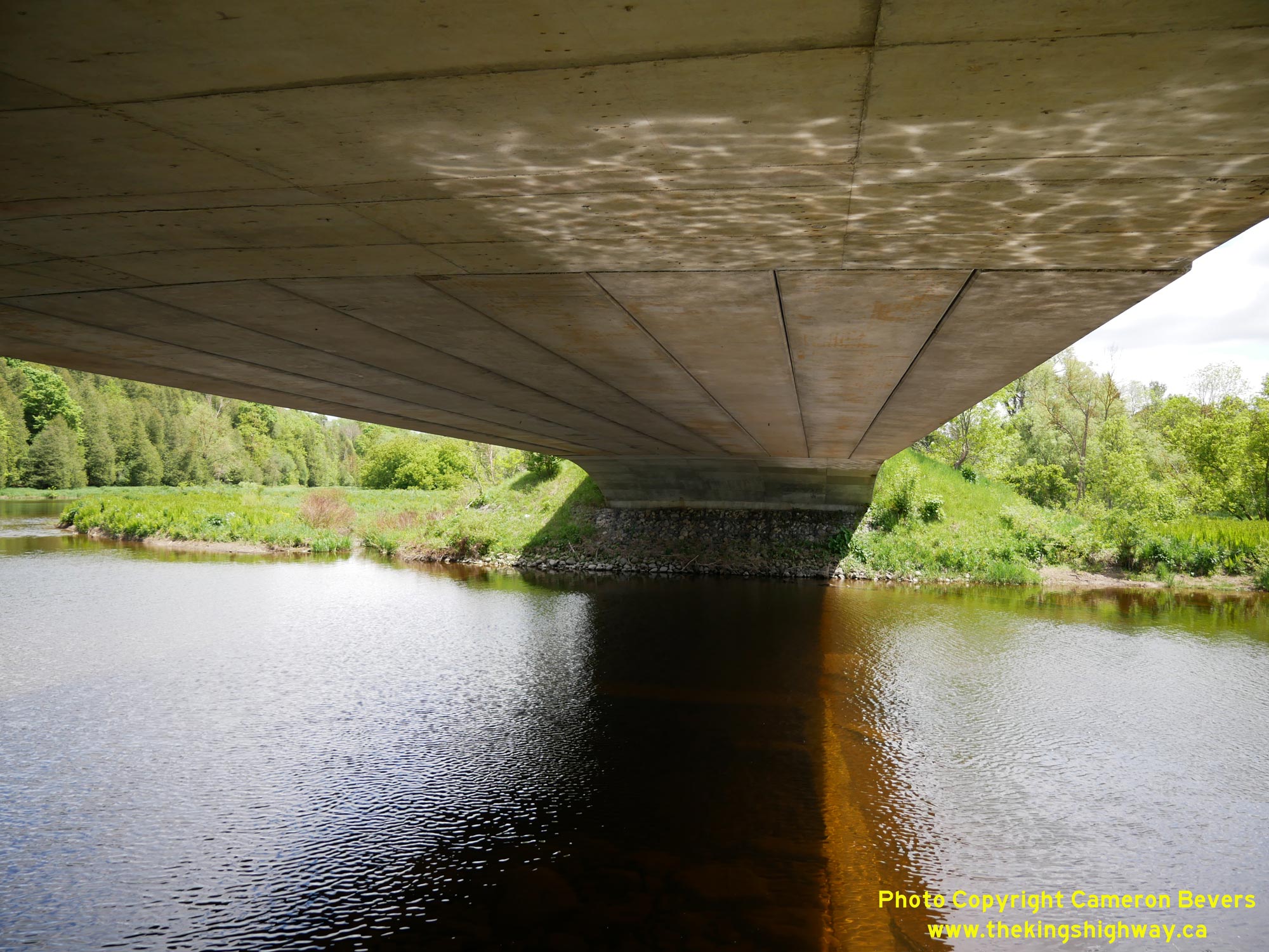 for any central piers in the river. See an Enlarged Photo Here.(Photograph taken on June 1, 2025 - © Cameron Bevers) Right - View underneath the deck of the South Saugeen River Bridge on Hwy 89 (Queen Street). From below, the concrete girder centre section can easily be