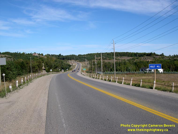 Left - Facing east along Hwy 89 approaching Violet Hill. See an Enlarged Photo here. (Photograph taken on September 8, 2007 - © Cameron Bevers) Right - Former alignment of Hwy 89 through Violet Hill. Several original sections of Hwy 89 such as this one were bypassed during highway improvement projects in the 1940s and 1950s between Primrose and Alliston. The current route of Hwy 89 can be seen off to the right. (Photograph taken on September 8, 2007 - © Cameron Bevers)