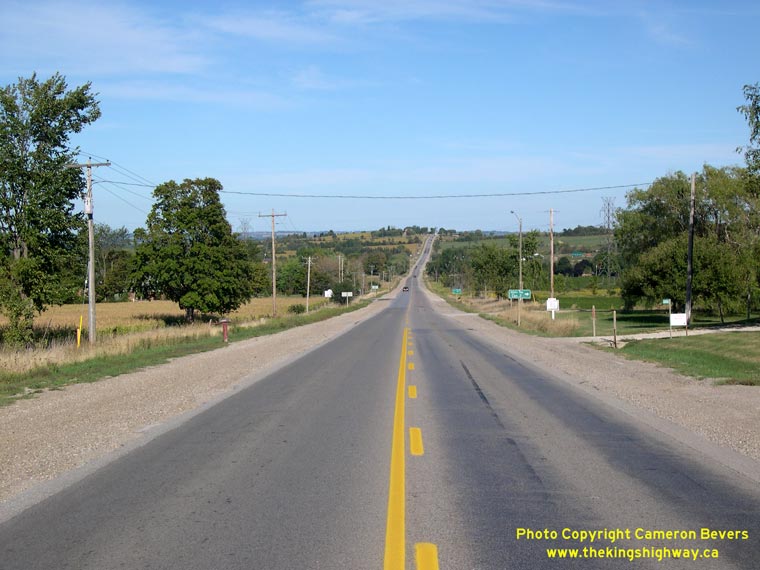 Left - Facing west along Hwy 89 towards Cookstown from Fennell. As a result of the mass highway downloading of 1997-1998, jurisdiction over a 5 km section of