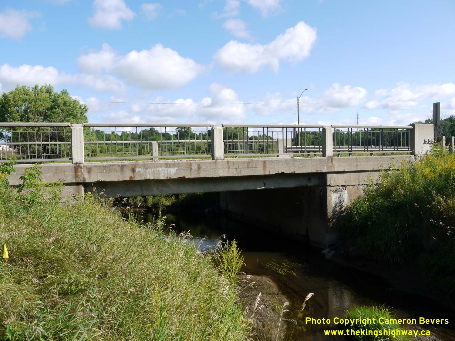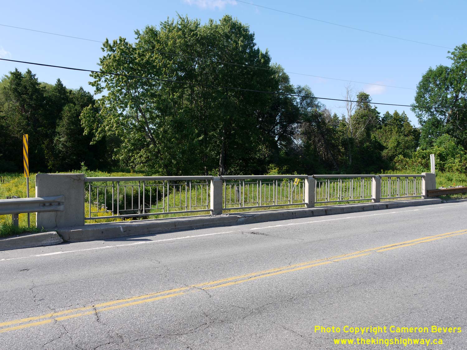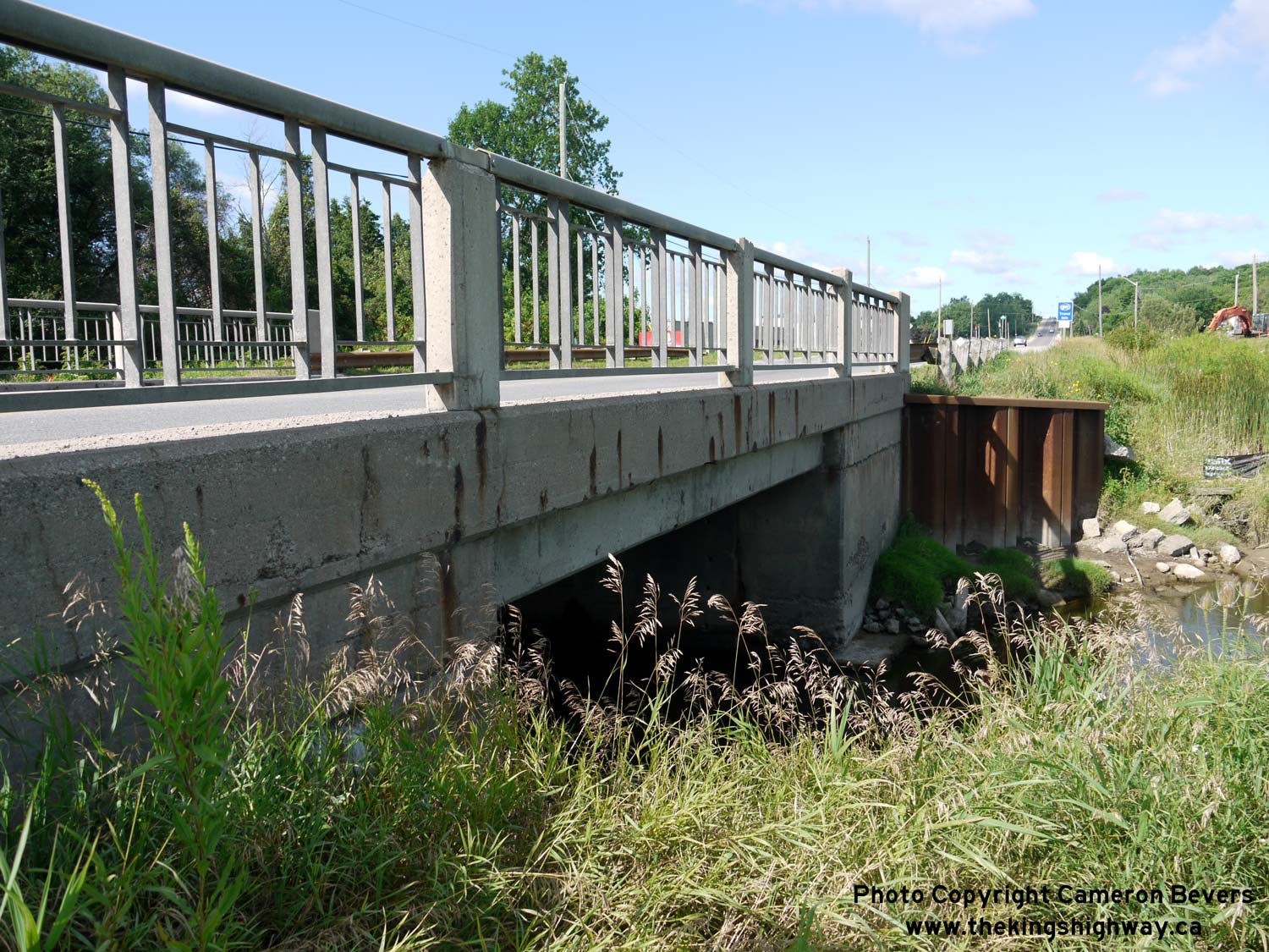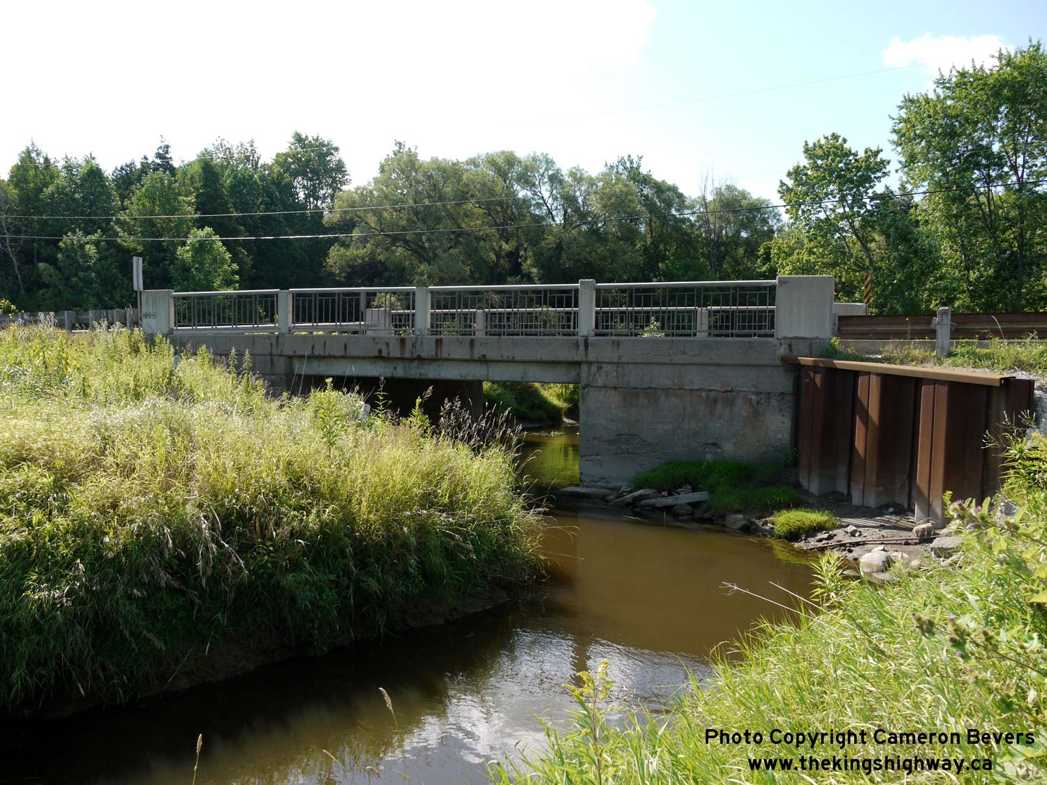 Enlarged Photo here. (Photograph taken on August 1, 2015 - © Cameron Bevers) Right - Southern side of the Innisfil Creek Bridge (Glass' Bridge) on Hwy 89 east of Cookstown. This single-span concrete structure was completed in 1913 and widened to its current width in 1957. The bridge was replaced in 2015-2016 after more than a century of service. See an Enlarged Photo here. (Photograph taken on August 1, 2015 - © Cameron Bevers)