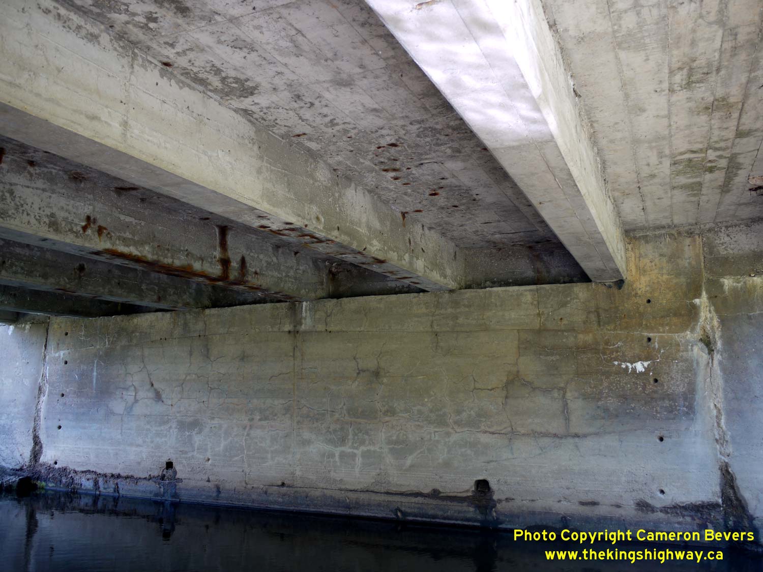 Enlarged Photo here. (Photograph taken on August 1, 2015 - © Cameron Bevers) Right - View of the concrete "T" beam superstructure of the Innisfil Creek Bridge (Glass' Bridge) on Hwy 89 east of Cookstown. The original centre part of Glass' Bridge was constructed in 1913. Extensions were built on both sides of the original bridge in 1957 by the County of Simcoe. See an Enlarged Photo here. (Photograph taken on August 1, 2015 - © Cameron Bevers)