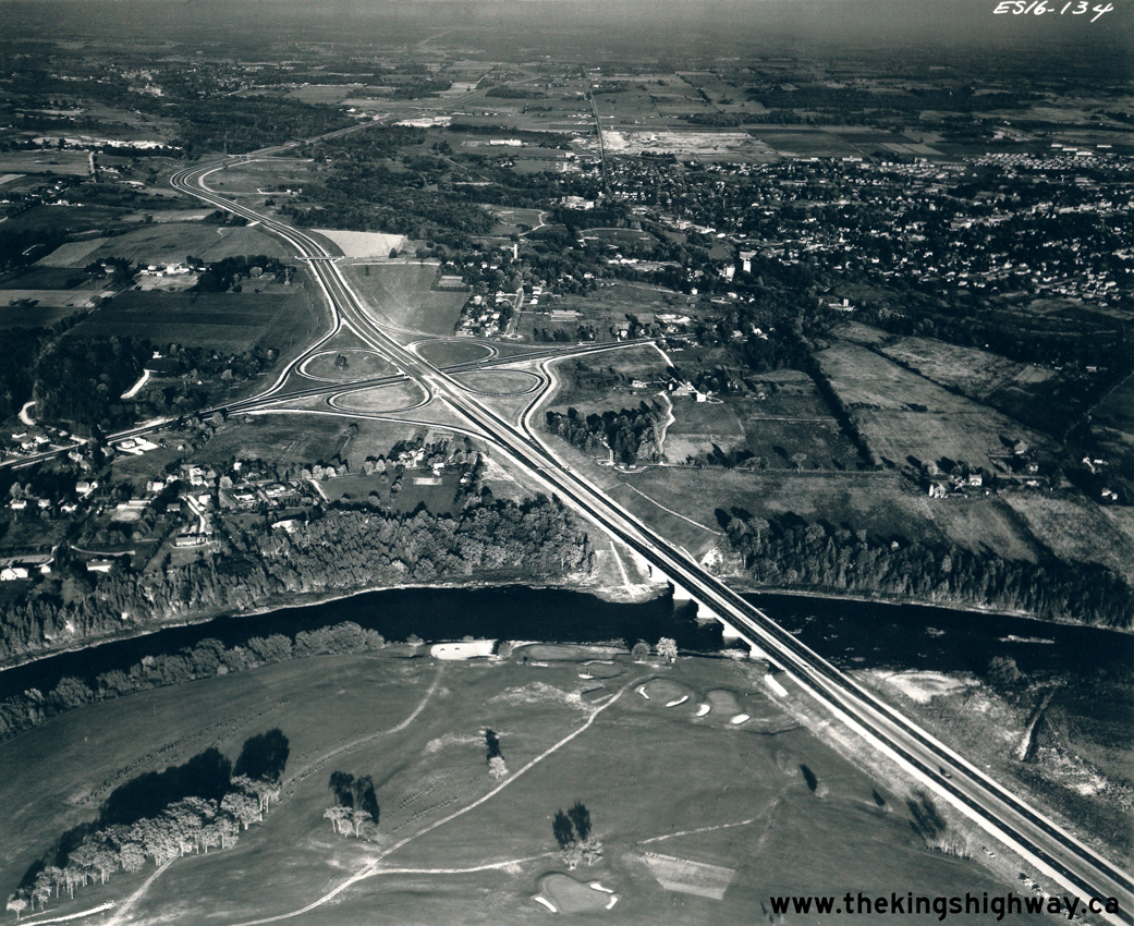 Above - Aerial view of the Hwy 8 Cloverleaf and Grand River Bridge on Hwy 401 between Kitchener and Preston in 1961, facing east. This photo shows the