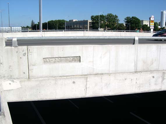 Left - New Franklin Street Overpass at Hwy 8. Structure completed in 2003. (Photograph taken on July 15, 2006 - © Cameron Bevers) Right - The date stamp on the Franklin Street Overpass incorrectly indicates that the structure was completed in 2001 (Photograph taken on July 15, 2006 - © Cameron Bevers)