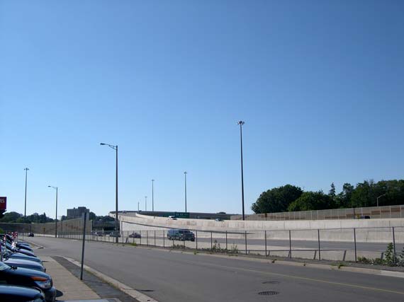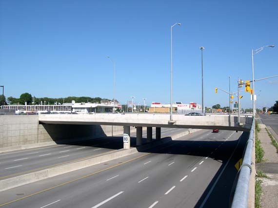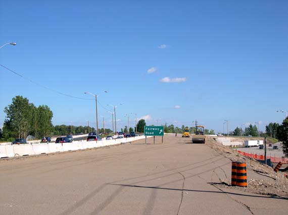 Left - Facing east along Hwy 8 from Franklin Street Overpass after reconstruction, showing the relocated retaining wall and the widened highway (Photograph taken on July 15, 2006 - © Cameron Bevers) Right - Facing west along Hwy 8 from Franklin Street Overpass towards the Hwy 8 Flyover after reconstruction (Photograph taken on July 15, 2006 - © Cameron Bevers)