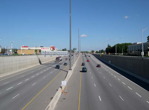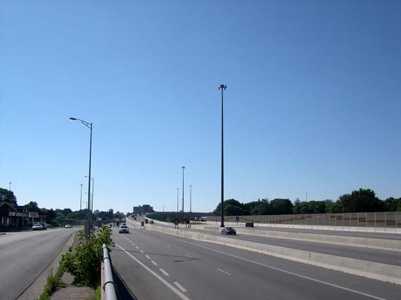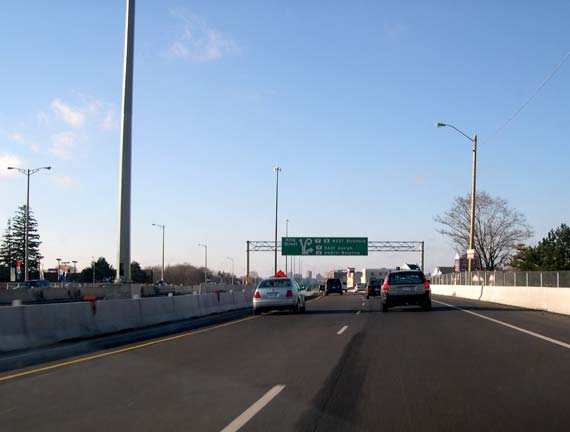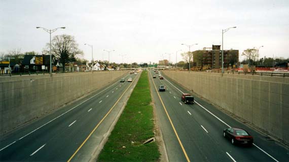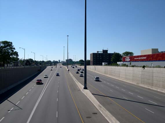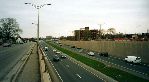 further back to permit the construction of an eight-lane highway. (Photograph taken in May, 2002 - © Cameron Bevers) Right - Facing west along Hwy 8 from Franklin Street Overpass before reconstruction (Photograph taken in May, 2002 - © Cameron Bevers)