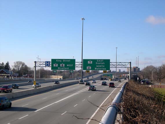 Left - Hwy 8 facing west towards Franklin Street Overpass (Photograph taken on December 24, 2006 - © Cameron Bevers) Right - Interchange diagram sign for Hwy 8 Interchange at Conestoga Parkway (Hwy 7) (Photograph taken on December 24, 2006 - © Cameron Bevers)