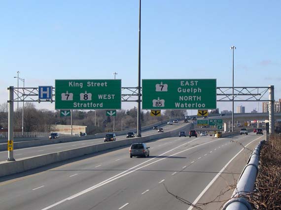 Left - The new ramp from the Conestoga Parkway to Hwy 8 East was completed in 2004, and is known locally as "The Flyover". (Photograph taken on July 15, 2006 - © Cameron Bevers) Right - Overhead signs approaching Hwy 7 (Conestoga Parkway) on Hwy 8 in Kitchener (Photograph taken on December 24, 2006 - © Cameron Bevers)