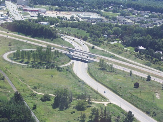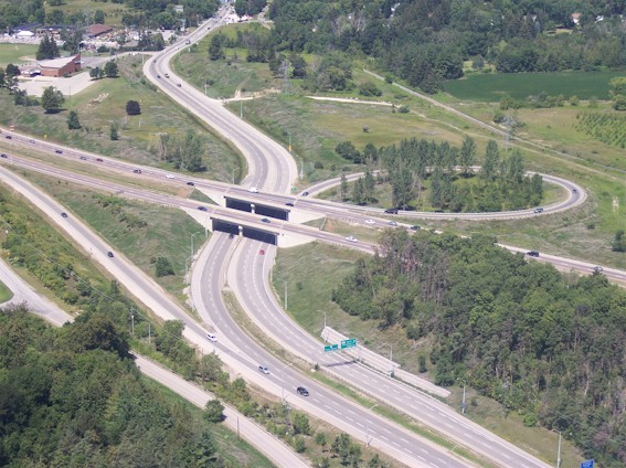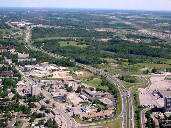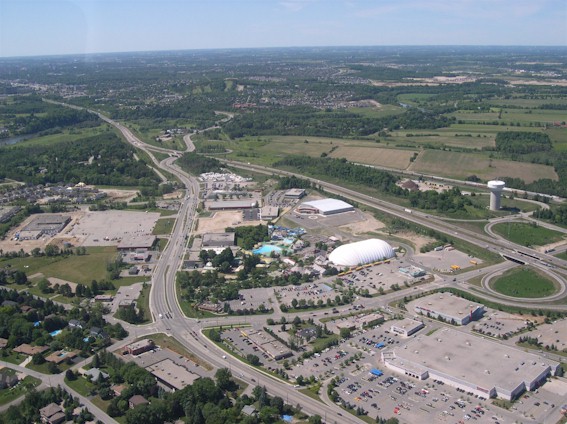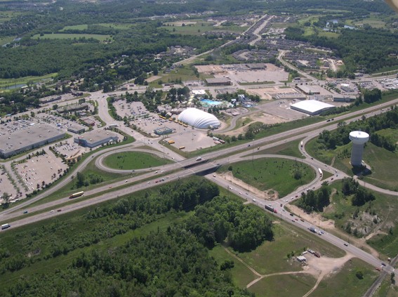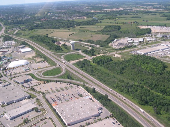 near the church parking lot in the foreground. (Photograph taken on August 1, 2006 - Photo courtesy of Mike Witmer © 2006) Right - Aerial view of Hwy 8 and Sportsworld Drive/Maple Grove Road Interchange in Kitchener, facing north (Photograph taken on June 22, 2005 - © Cameron Bevers)