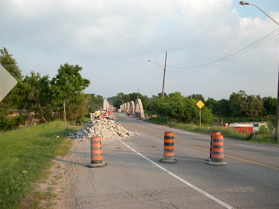 Left - Freeport Bridge on Old Hwy 8 in Kitchener. Structure completed in 1926. (Photograph taken on July 2, 2003 - © Cameron Bevers) Right - Rehabilitation of the Freeport Bridge in 2003. The bridge was restored precisely to its original 1926 specifications, and now serves as a textbook example of historical preservation. (Photograph taken on July 2, 2003 - © Cameron Bevers)